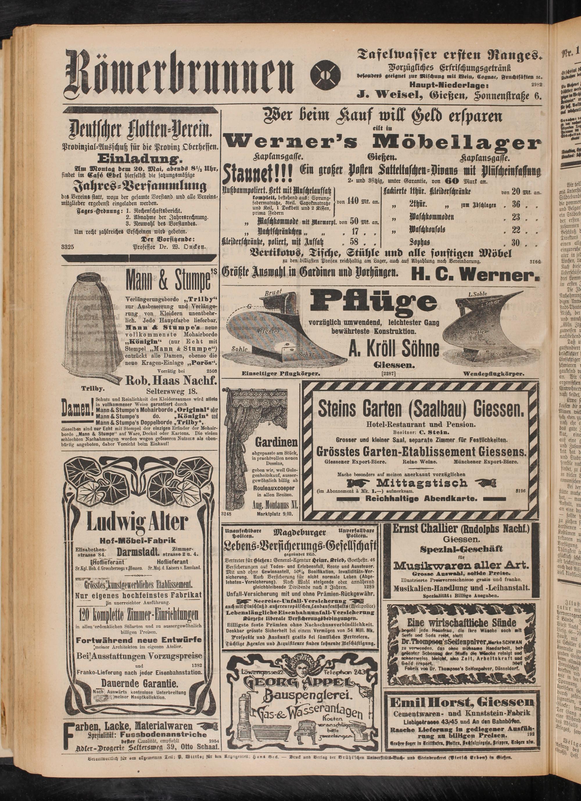 Vertreter für Hießen: General-Lgentur Heinr. Krieb, Goethestr. 46 Versicherungen auf Todes- und Erlebensfall, Rente und Aussteuer. Mit und ohne Gewinnanteil, 50% Bonifikation, Invaliditäts-Versicherung. Auch Versicherung für nicht normale Leben (Abgelehnten-Versicherung). Nach Wahl steigende oder annähernd gleichbleibende Dividende nach 3 Jahren. 1289