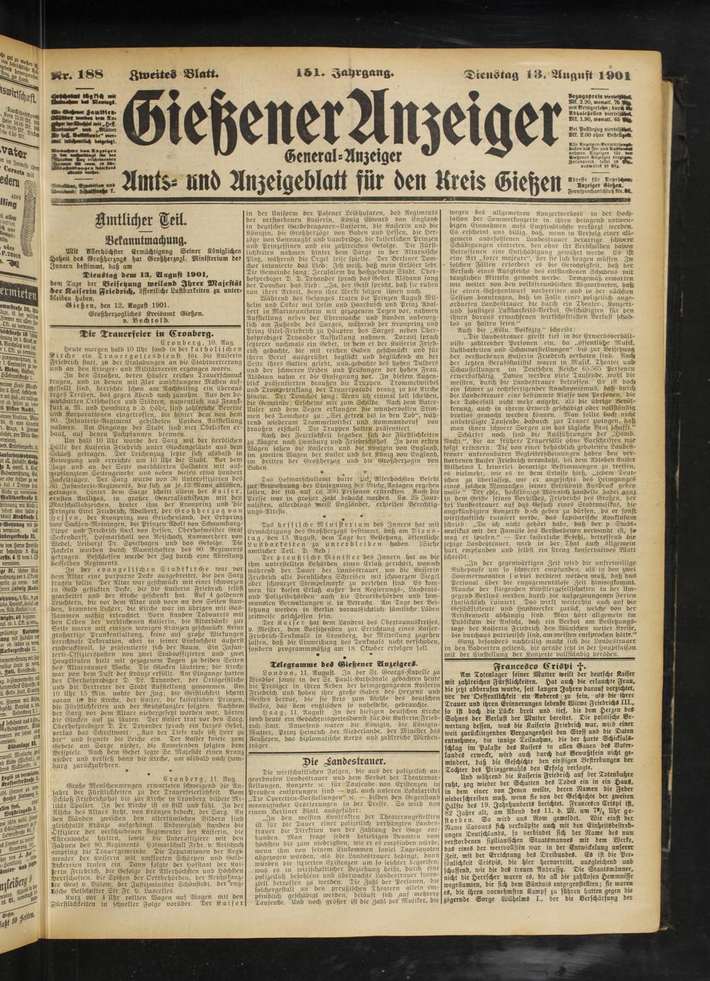 DienStag dem 13. Aagust 1901, dem Tage der Beisetzung weiland Ihrer Majestät der Kaiserin Friedrich, öffentliche Lustbarkeiten zu unterbleiben haben.
