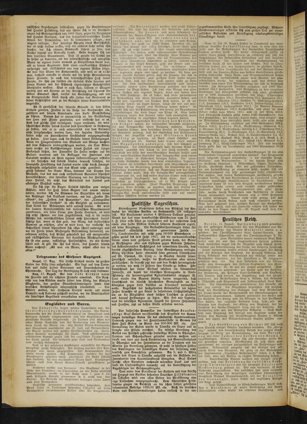 Kitchener meldet aus Pretoria: Ein Blockhaus in der Nähe von Brandfort (im Oranjestaat an der Bahn nördlich Bloemfontein) wurde in der Nacht vom 7. zum 8. ds. nach heftigem Kampfe genommen ch. h. wohl von den Buren). Die Verlusts der Engländer betrugen einen Toten und drei Verwundete.
