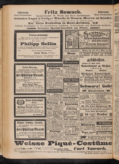 Gießen, Frankfurt n. M., 13. Mai 1901. Die Beerdigung findet statt: Dienstag, den 14. Mai, nachmittags 4J/4 Uhr, vom Sterbehause Ludwigsplatz 8.