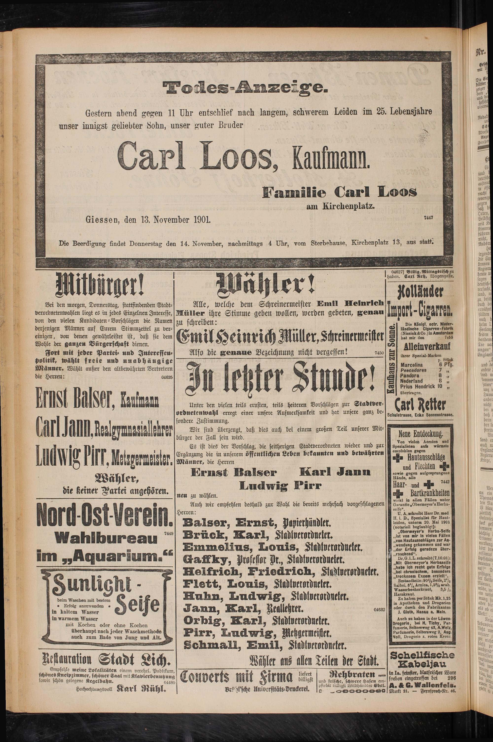 Die Beerdigung findet Donnerstag den 14. November, nachmittags 4 Uhr, vom Sterbehause, Kirchenplatz 13, aus statt.