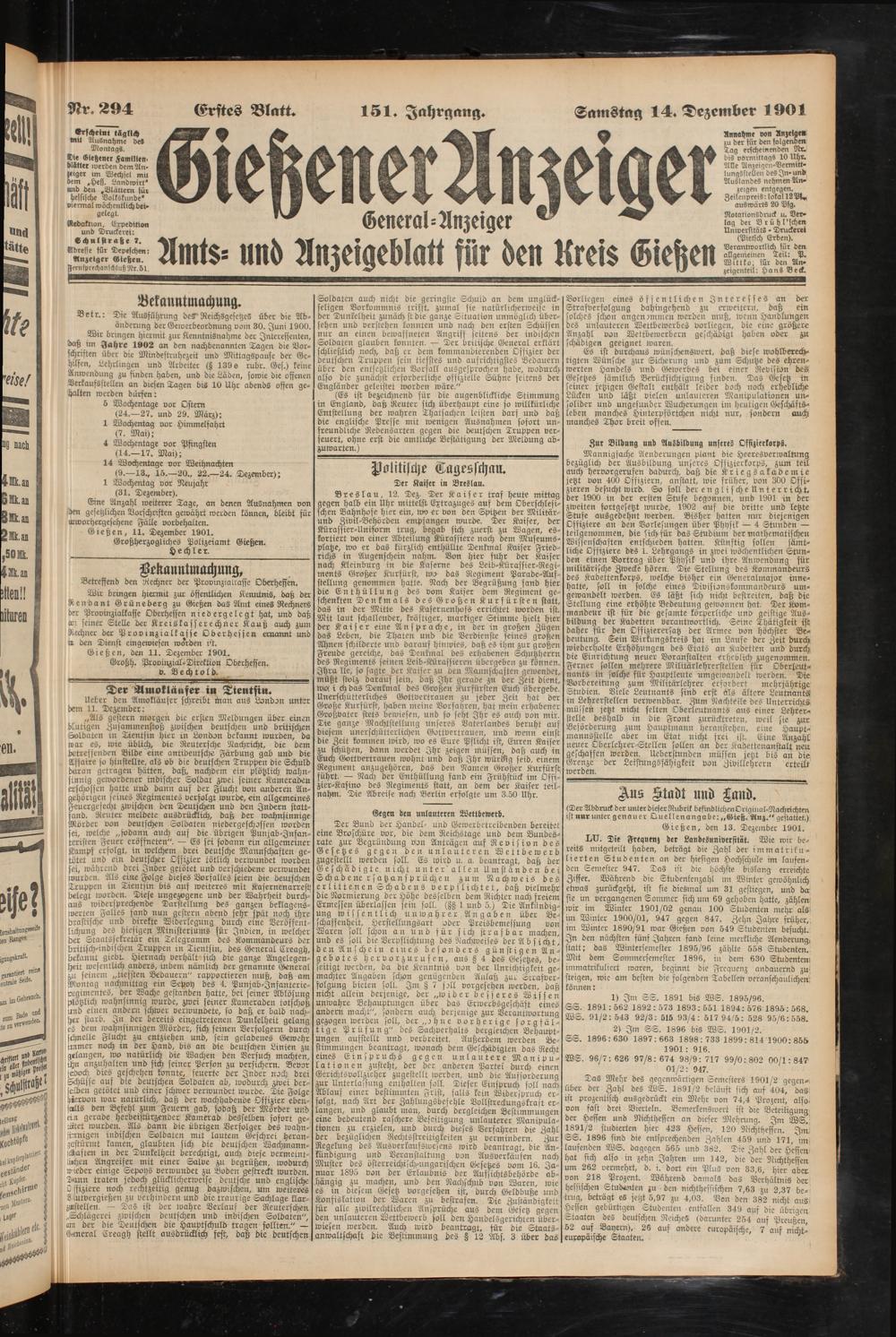 (Der Abdruck der unter dieser Rubrik befindlichen Original-Nachrichten ist nur unter genaue r Q u e l l e n a n g a b e: „Gicß. Auz." gestattet.) Gießen, den 13. Dezember 1901.