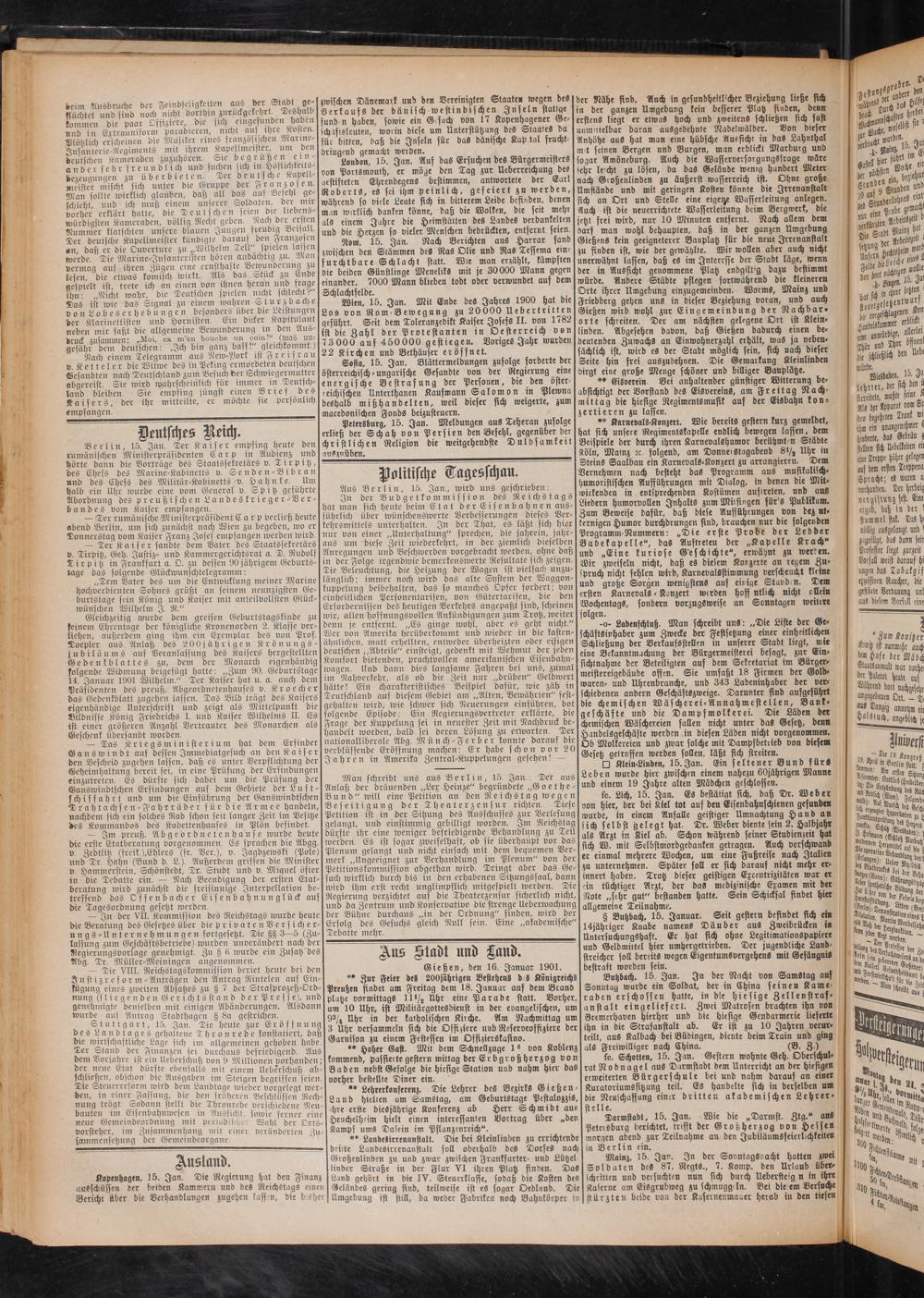 Butzbach, 15. Jan. In der Nacht von Samstag auf Sonntag wurde ein Soldat, der in China feinen Karne raden erschossen hatte, in die hiesige Zellenstraf- anstalt eingeliefert. Zwei Matrosen brachten ihn von Bremerhaven hierher und die hiesige Gendarmerie lieferte ihn in die Strafanstalt ab. Er ist zu 10 Jahren verurteilt, aus Kaibach bei Büdingen, diente beim Train und ging