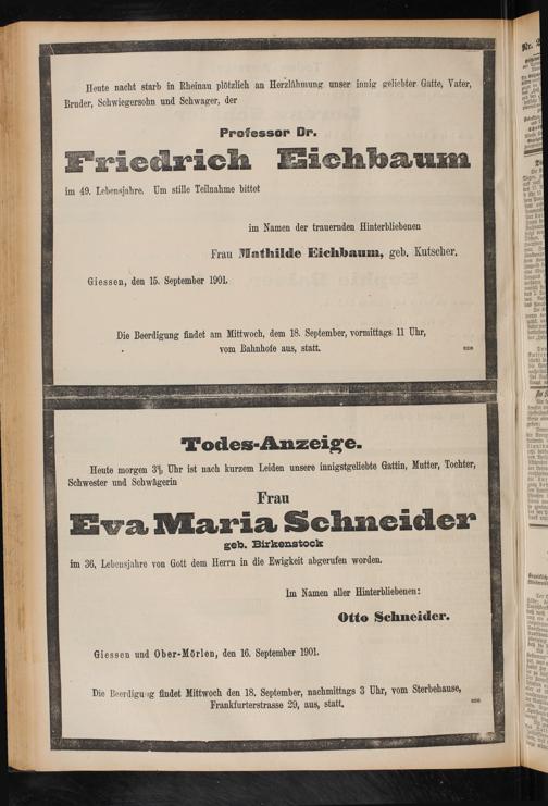 Die Beerdigung findet Mittwoch den 18. September, nachmittags 3 Uhr, vom Sterbehause, Frankfurterstrasse 29, aus, statt.