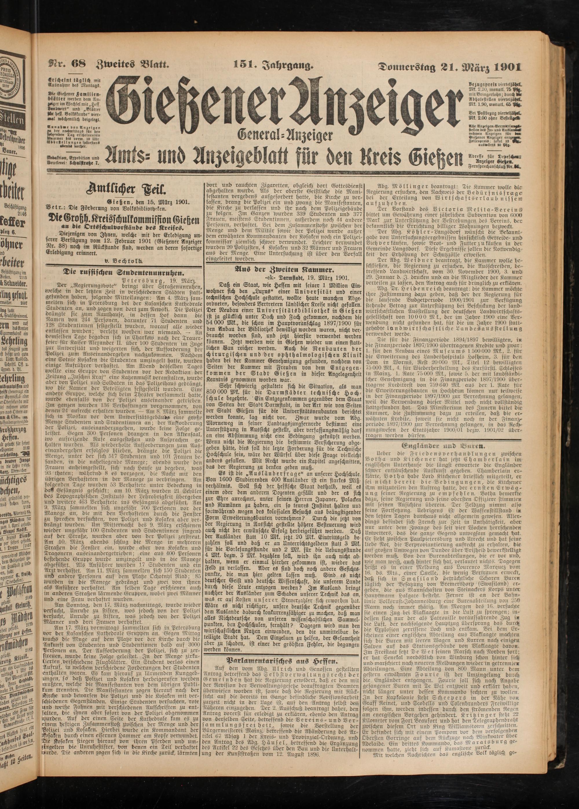 Daß ein Staat, wie Hessen mit seiner 1 Million Einwohner sich den „Luxus" einer Universität und einer technischen Hochschule gestattet, wollte heute manchen Abgeordneten, besonders Vertretern ländlicher Kreise nicht gefallen. Der Neubau einer Universitätsbibliothek in Gießen ist ja glücklich unter Dach und Fach gekommen, nachdem die 54 000 Mk., die schon im Hauptvoranschlag 1897/1900 für den Anbau der Bibliothek bewilligt worden waren, nicht verbraucht worden sind, und jetzt hierfür verwendet werden können. Jetzt werden wir in Gießen wieder um einen stattlichen Bau reicher werden. Auch die Neubauten der chirurgischen und der ophthalmologischen Klinik haben bei der Kammer Genehmigung gefunden, nachdem von Seiten der Kammer mit Freuden von dem Entgegenkommen der Stadt Gießen in dieser Angelegenheit Kenntnis genommen worden war.