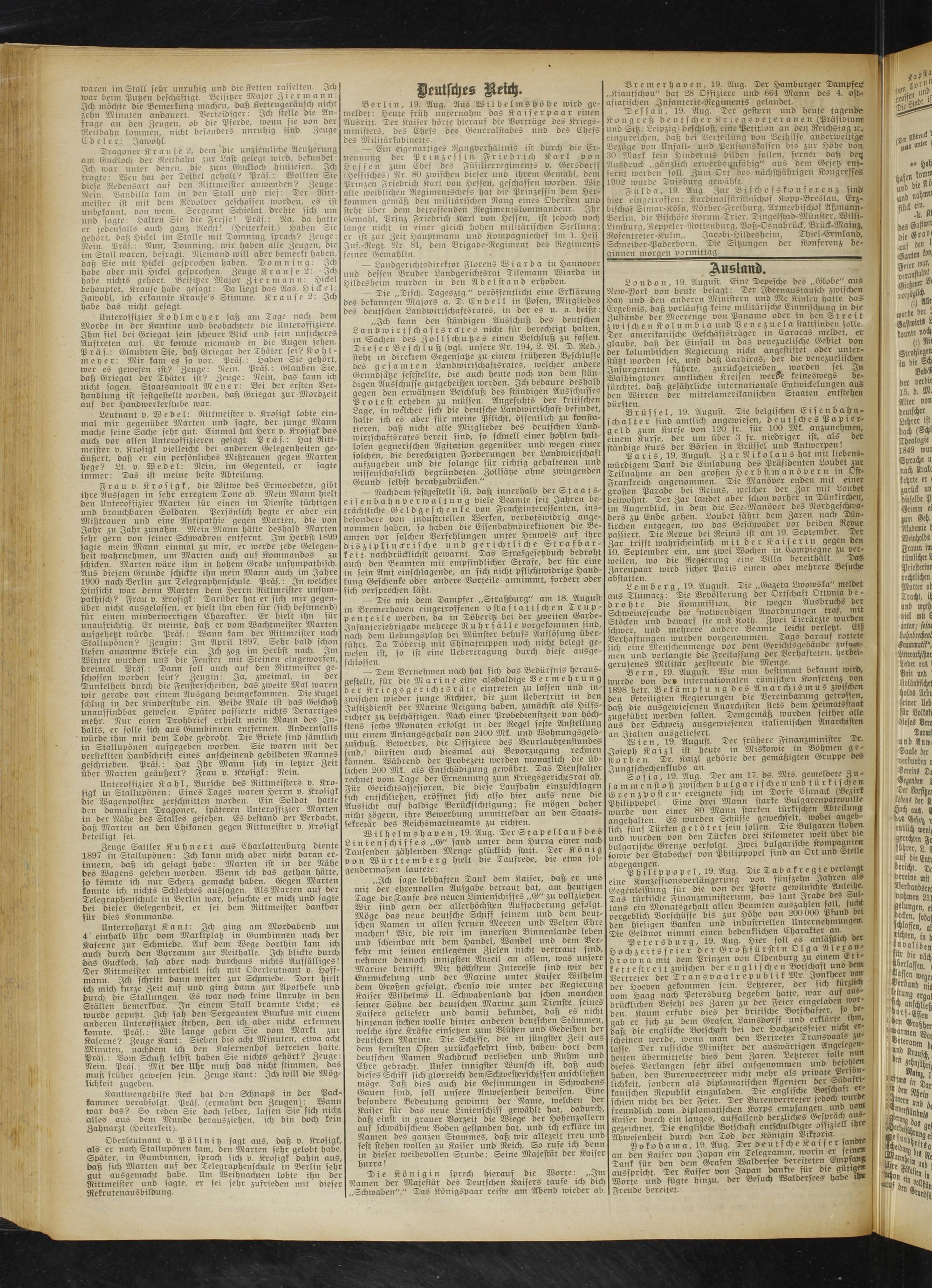 Berlin, 19. Aug. Aus Wilhelms höhe wird gemeldet: Heute früh unternahm das Kaiserpaar einen Ausritt. Ter Kaiser hörte hierauf die Vorträge des Kriegsministers, des Chefs des Generalstabes und des Chefs des Militärkabinetts.