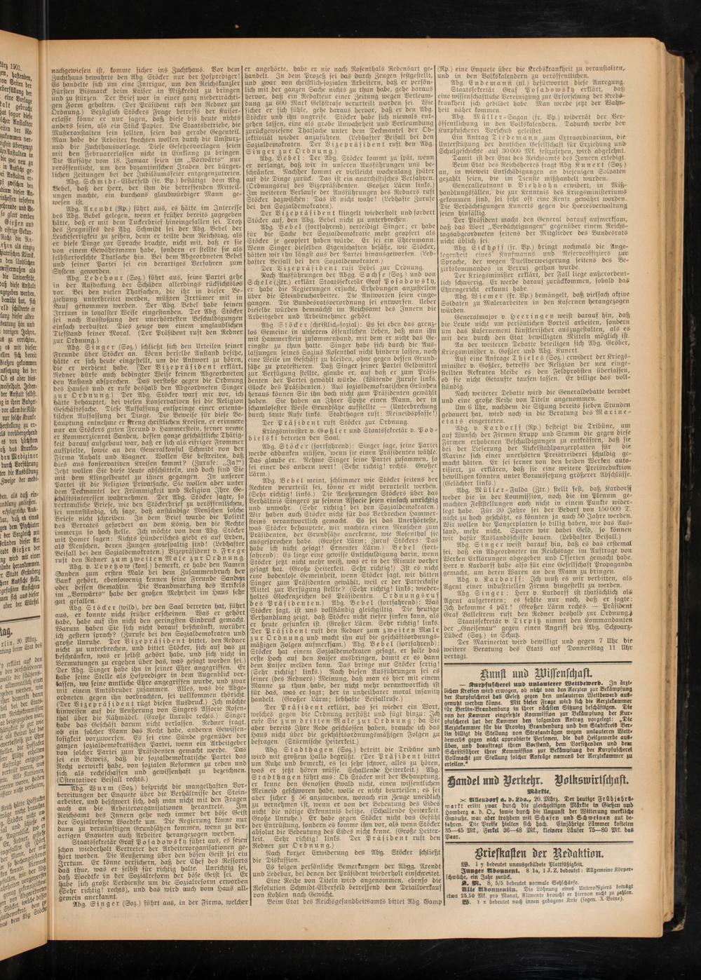 Abg. Arendt (Rp.) führt aus, es hätte im Interesse des Abg. Bebel gelegen, wenn er früher bereits zugegeben hätte, daß er mit dem Tuckerbrief hineingefallen sei. Trotz Leichtfer?igkeit^ zu^zeihen' tPenn e^ teilte^bem^Rei^tag, alsI für bie Sache der Sozialbemokratie mehr geopfert 'alsI^säbgeorbneten seitens" ber Mitglieber des Bundesrats hfefe Dinae rur Svracke brackte nickt mit daß er sie Stöcker je geopfert haben wurde. Er sei em Ehrenmann, nicht üblich )ci.