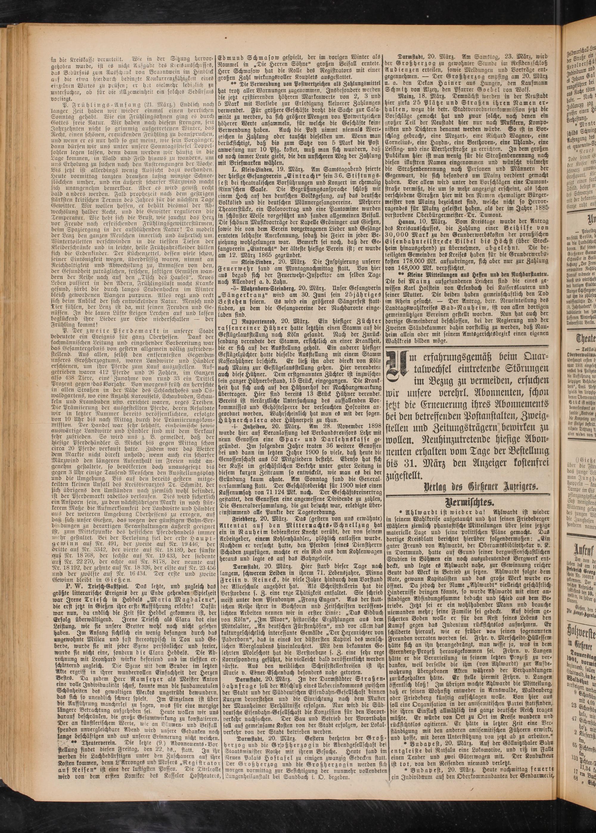 lange beschäftigen und aufl unserer Erinnerung nicht weichen.! Darmstadt, 20. März. Gestern beehrten der Groß-