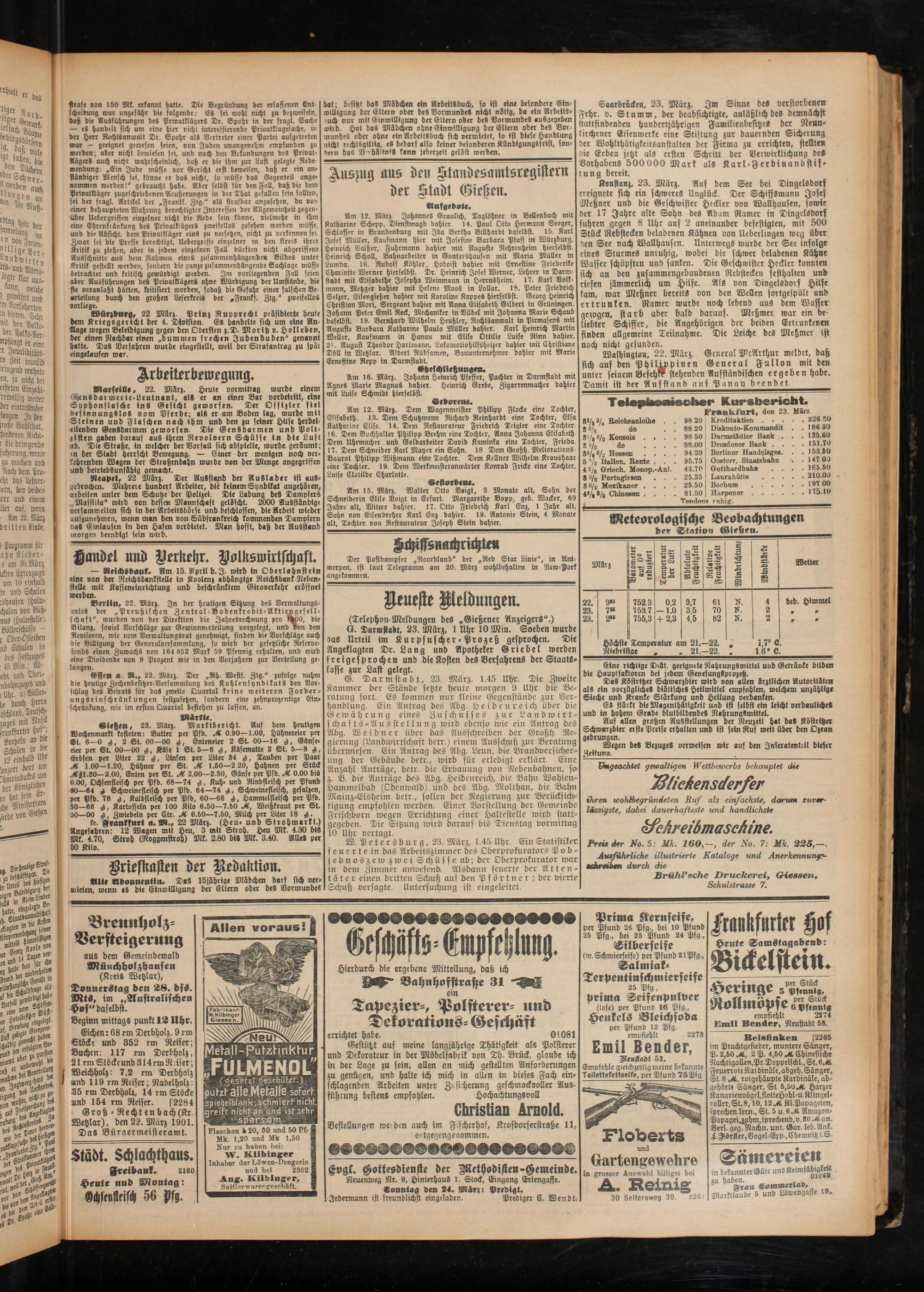 Am 12. März Johannes Graulich, Taglöhner in Bellenbach mit Katharine Schepp, Dienstmagd dahier. 14. Paul Otto Hermann Seeger, Schlaffer in Brandenburg mit Ida Bertha Billhardt daselbst. 15. Karl Josef Müller, Kaufmann hier mit Josefine Barbara Pfaff in Würzburg. Hemrich Balßer, Fuhrmann dahier mit Auguste Rehrenheim hierselbst. Heinrich Scholl, Bahnarbeiter in Gontershausin mit Maria Müller in Lumda. 16. Rudolf Köhler, Hoboist dahier mit Ernestine Friederike Chariotte Werner hierselbst. Dr. Heinrich Josef Werner, Lehrer in Darmstadt mit Elisabethe Josepha Weinmann in Herrnsheim. 17. Karl Volk mann, Metzger dahier mit Helene Moos in Lollar. 18. Peter Friedrich Selzer, Eisengießer dahier mit Karoline Kappe« hierselbst. Georg Heinrich Christian Mori, Sergeant dahier mit Anna Elisabeth Gilbert in Grüningen. Johann Peter Emil Reck, Mechaniker in Vilbel mit Johanna Marie Schaub daselbst. 19. Bernhard Wilhelm Heußler, Rechtsanwalt in Pirmasens mit Auguste Barbara Katharine Paula Müller dahier. Karl Heinrich Martin Weller, Kaufmann in Hanau mit Elise Ottilie Luise Rinn dahier. 21. August Theodor Hartmann, Lokomotivhilfsheizer dahier mit Christiane Döll in Wetzlar. Albert Rübsamen, Bauunternehmer dahier mit Marie Ernestine Repp in Darmstadt.