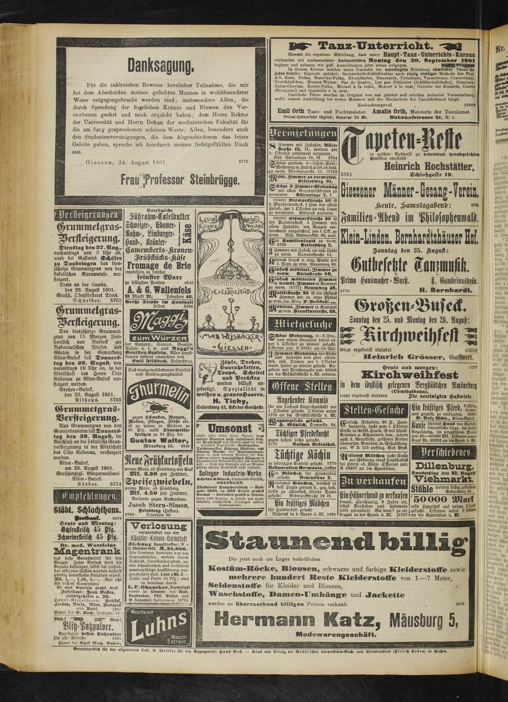 Das diesjährige Grummetgras von 15 Morgen Freiherrlich von Nordeck zur Rabenauischen Wiesen und Gärten in der Gemarkung Alten-Buseck soll Donnerstag den »9. August, von vormittags 10 Uhr an, in der Wirtschaft des Herrn Otto Rabenau zu Alten-Buseck versteigert werden.