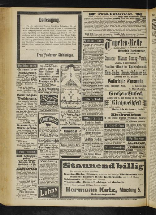 Hiermit die ergebene Mitteilung, dass unser Haupt - Tanz - Unterrichts - Kursus verbunden mit umfassendster Anstandslehre Montag den 30. September 1901 beginnt und nehmen wir gefl. Anmeldungen jetzt schon entgegen.