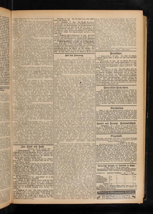 A Gedern, 24. Jan. Gestern wurden durch den Land gerichtsrat Sandmann aus Gießen und durch zwei Mutige Rechtsanwälte die Quellen der hiesigen projektierten Wasserleitung in Augenschein genommen, da die hiesigen MLller mit der Gemeinde bezüglich dieser Quellen pro- Meren.
