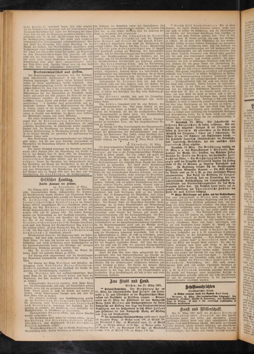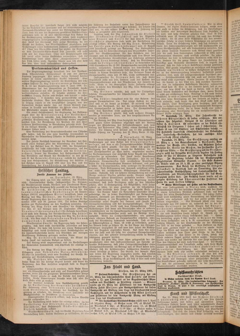 Darmstadt, 24. März. Der Großherzog empfing am 23. März u. a. den Generalleutnant v. Perbandt, Kommandeur der Großh. (25.) Division, deu Geheimen Hofrat Professor Dr. Netto von Gießen, den Forstmeister Hallwachs von Nidda.— Der Großherzog und die Großherzogin nebst der Prinzessin Elisabeth begaben sich Freitag abend 10 Uhr 24 Minuten zu längerem Aufenthalte nach Nizza. In Begleitung befindet sich der Großherzogliche Flügeladjutant Rittmeister Kraemer. — Die Erste Kammer der Stände wird am 28. d. M. zu einer zweitägigen Sitzung zusammentreten. Aus Anlaß der Eröffnung der Lungenheilanstalt in Sandbach fand am Donnerstag hier eine außerordentliche Ausschußsitzung des LandeSauSschusieS der JnvaliditätS- und Altersversicherungsanstalt für das Groß- -erzogtum Hessen statt. Im Anschluß daran wurde auf ergangene Einladung das Therapeutische Institut des ^errn Dr. med. Lossen besichtigt.
