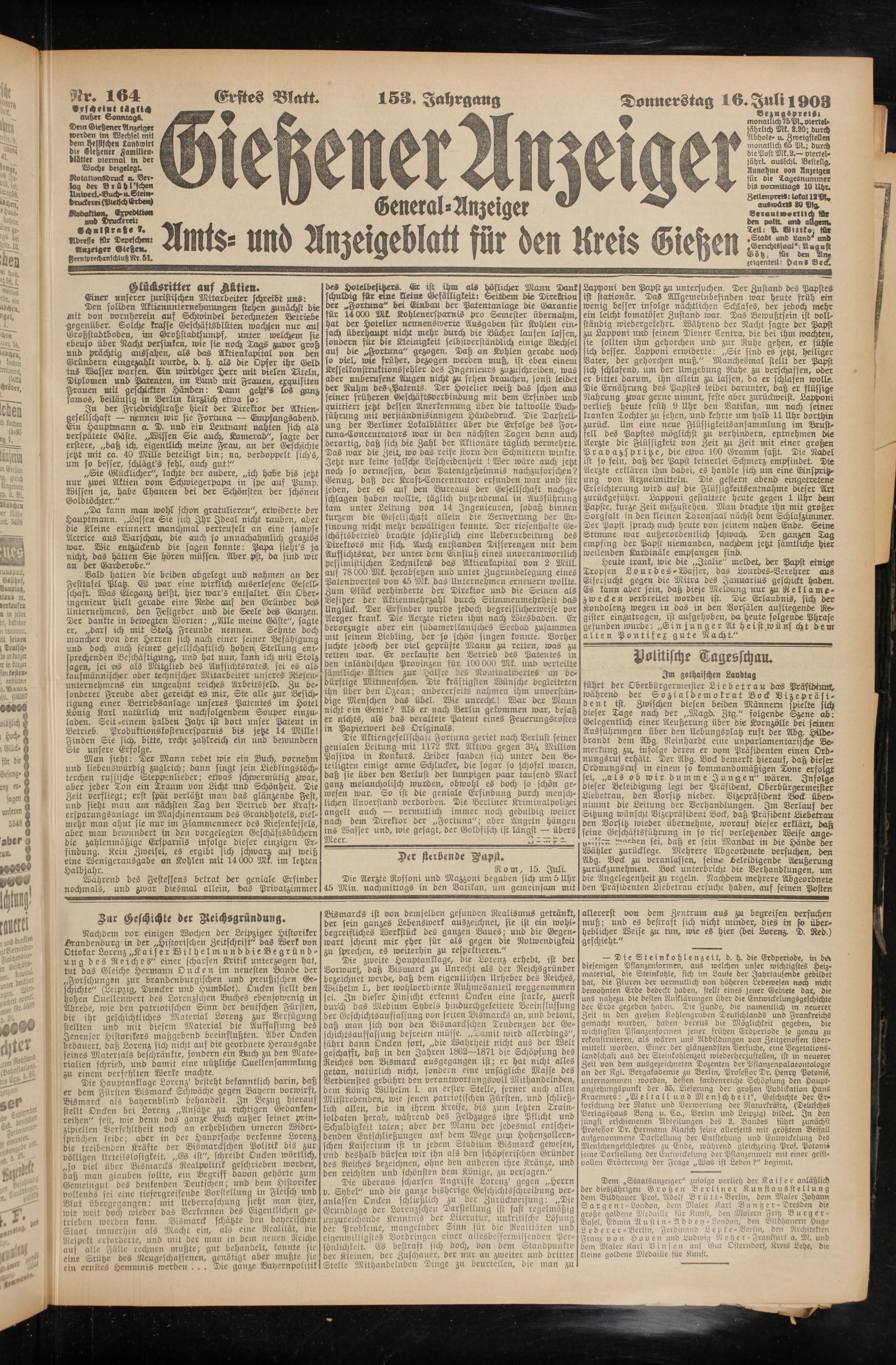 Heute trank, wie die „Jtalie" meldet, der Papst einige Tropfen Lourd es-Wasser, das Lourdes-Verehrer aus Eifersucht gegen die Mitra des Januarius geschickt haben. Es kann aber sein, daß diese Meldung nur zu Reklamezwecken verbreitet worden ist. Die Erlaubnis, sich der Kondolenz wegen in das in den Vorsälen aufliegende Register einzutragen, ist aufgehoben, da heute folgende Phrase gefunden wurde: „Ein junger At Heist wüns cht dem alten Pontifex gute Nacht."