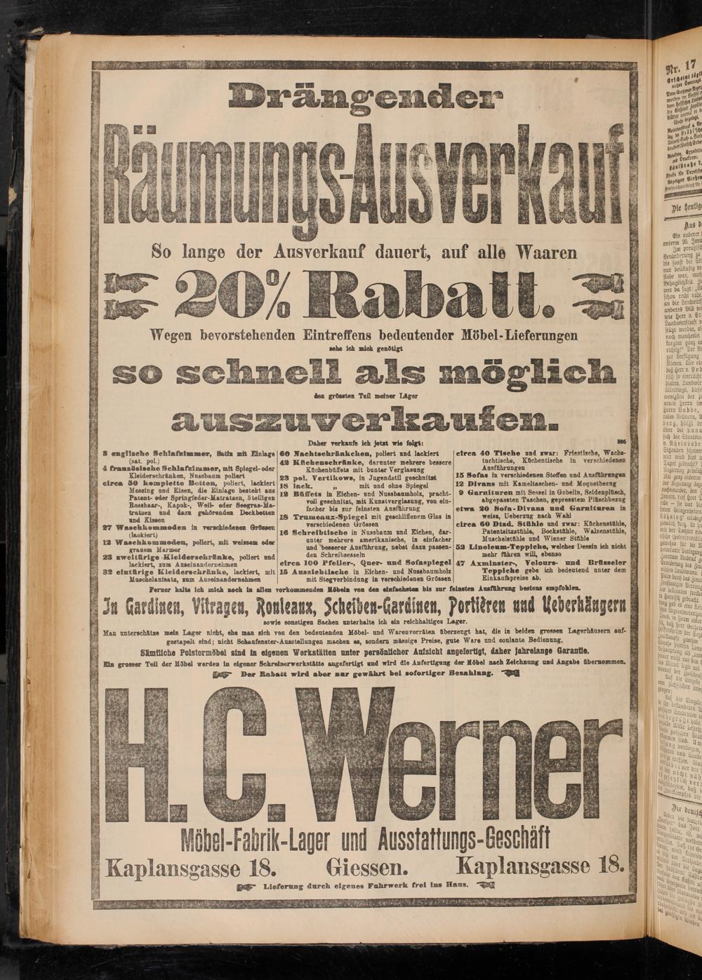 Hel-Fabrik-Lager und Ausstattungs-Geschäft Kaplansgasse 18. Giessen. Kaplansgasse 18 J ye$T Lieferung durch eigenes Fuhrwerk frei In» Haus.