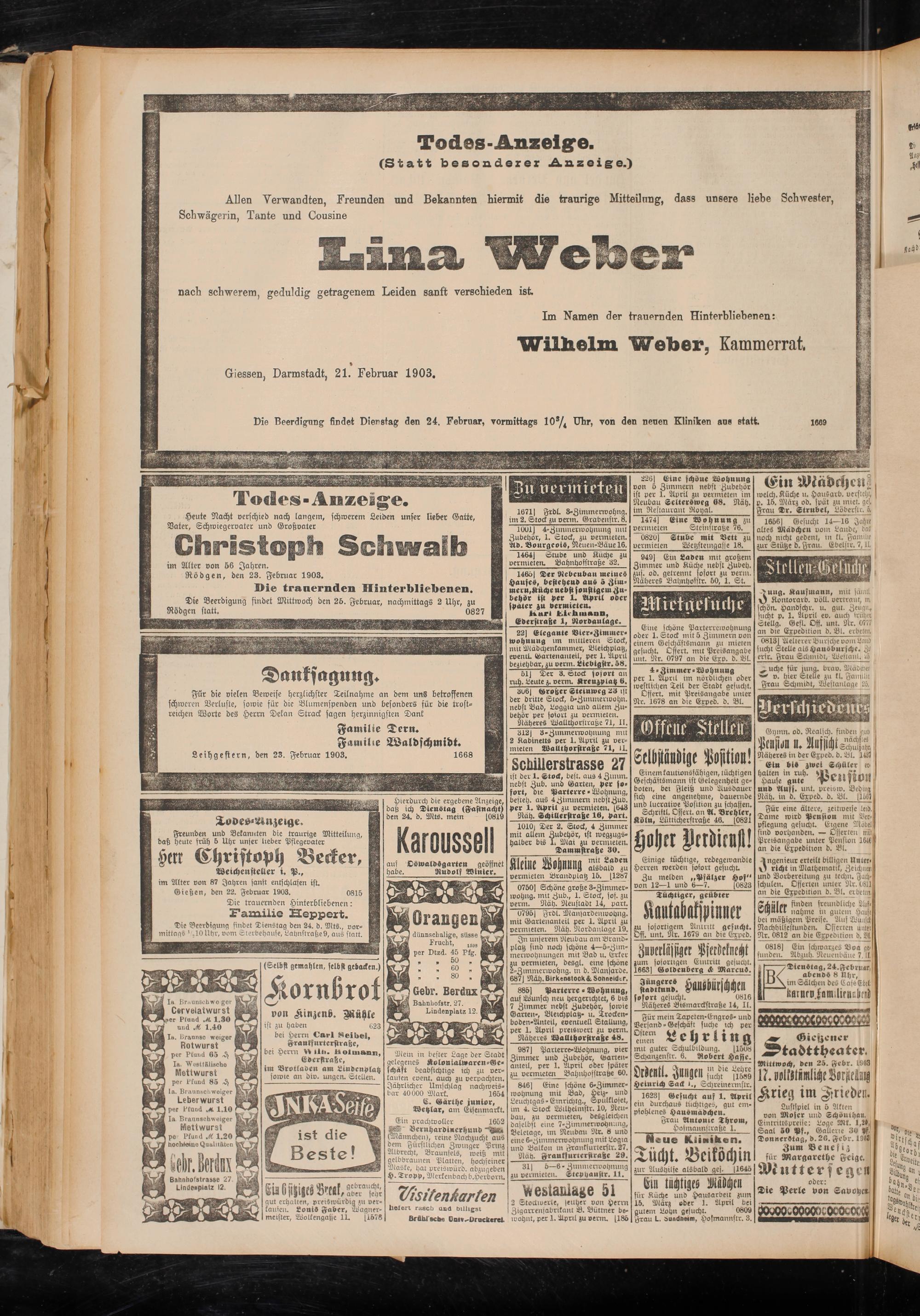 Weichensteller i. P., im Alter von 87 Jahren sanft entschlafen ist. Gießen, den 22. Februar 1903.