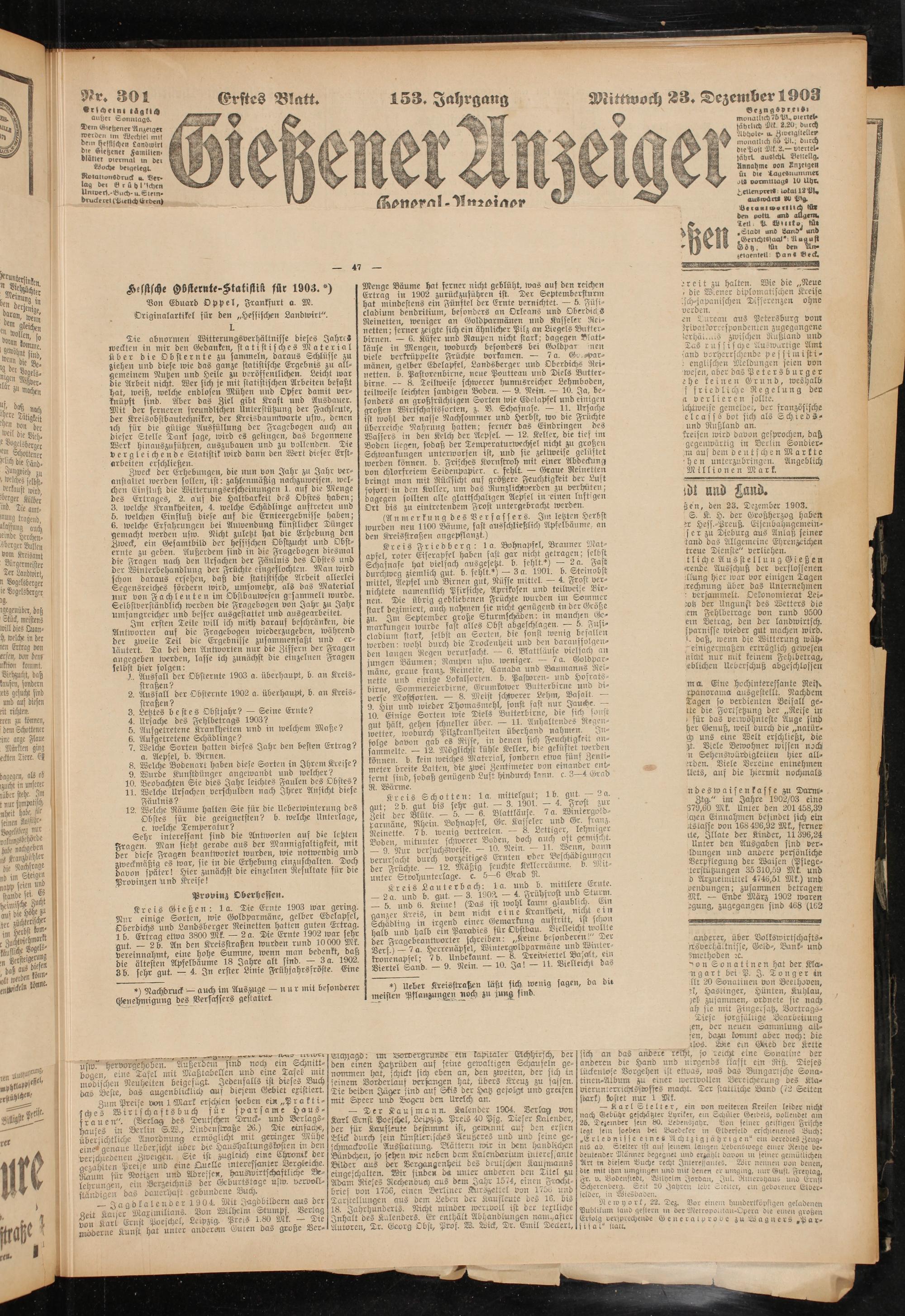 Kreis Gießen: la. Die Ernte 1903 war gering. Nur einige Sorten, wie Goldparmäne, gelber Edelapfel, Oberdichs und Landsberger Reinetten hatten guten Ertrag. 1b. Ertrag etwa 3800 Mk. — 2a. Die Ernte 1902 war sehr ,flut —2b. An den Kreisstraßen wurden rund 10000 Mk. vereinnahmt, eine hohe Summe wenn man bedenkt daß die ältesten Apfelbäume 18 Jahre alt smd. - 3a. 1902. Zb. sehr gut. — 4. In erster Lime Fruhjahrsfröste. Eine