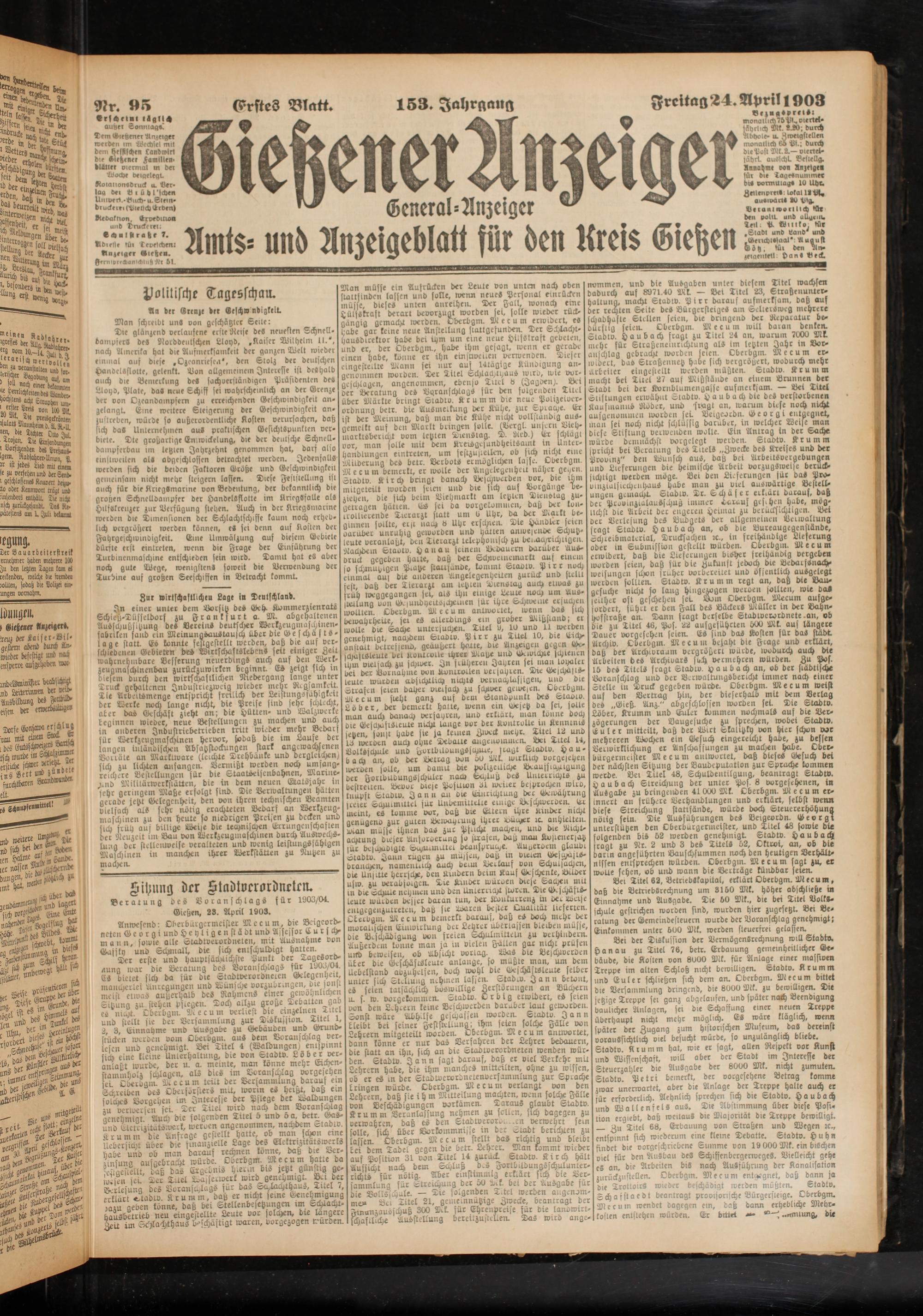 Verarung des Bocanschlags für 1903/01 Gießen, 28. April 1903.