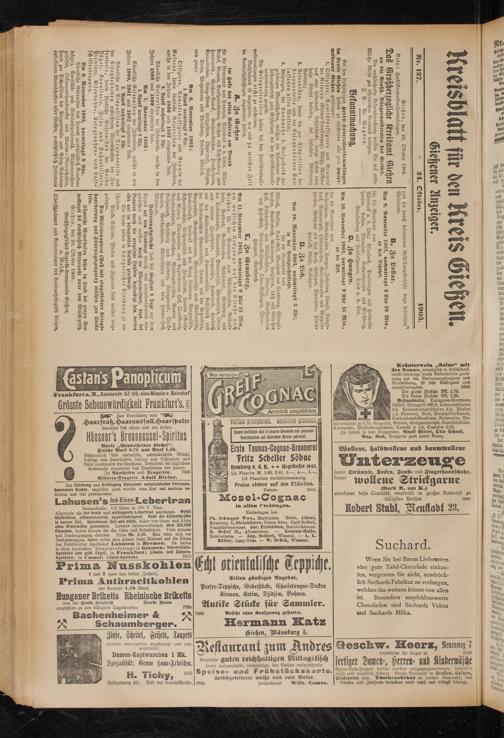 Ph. Schwager Wwe., Marktplatz. Gebr. Adami, Mäusburg. L. Steinhäuser, Neuen-Bäue. Carl Seibel, Frankfurterstrasse. Jac. Friesleben, Bahnhofstrasse. EL Bellof II., Alicestrasse. — Konsum-Halle, Heuchelheim. — Aug. Seibert, Wieseck. — A. L. Müller, Lang-Göns. — W. Brück, Wissmar.