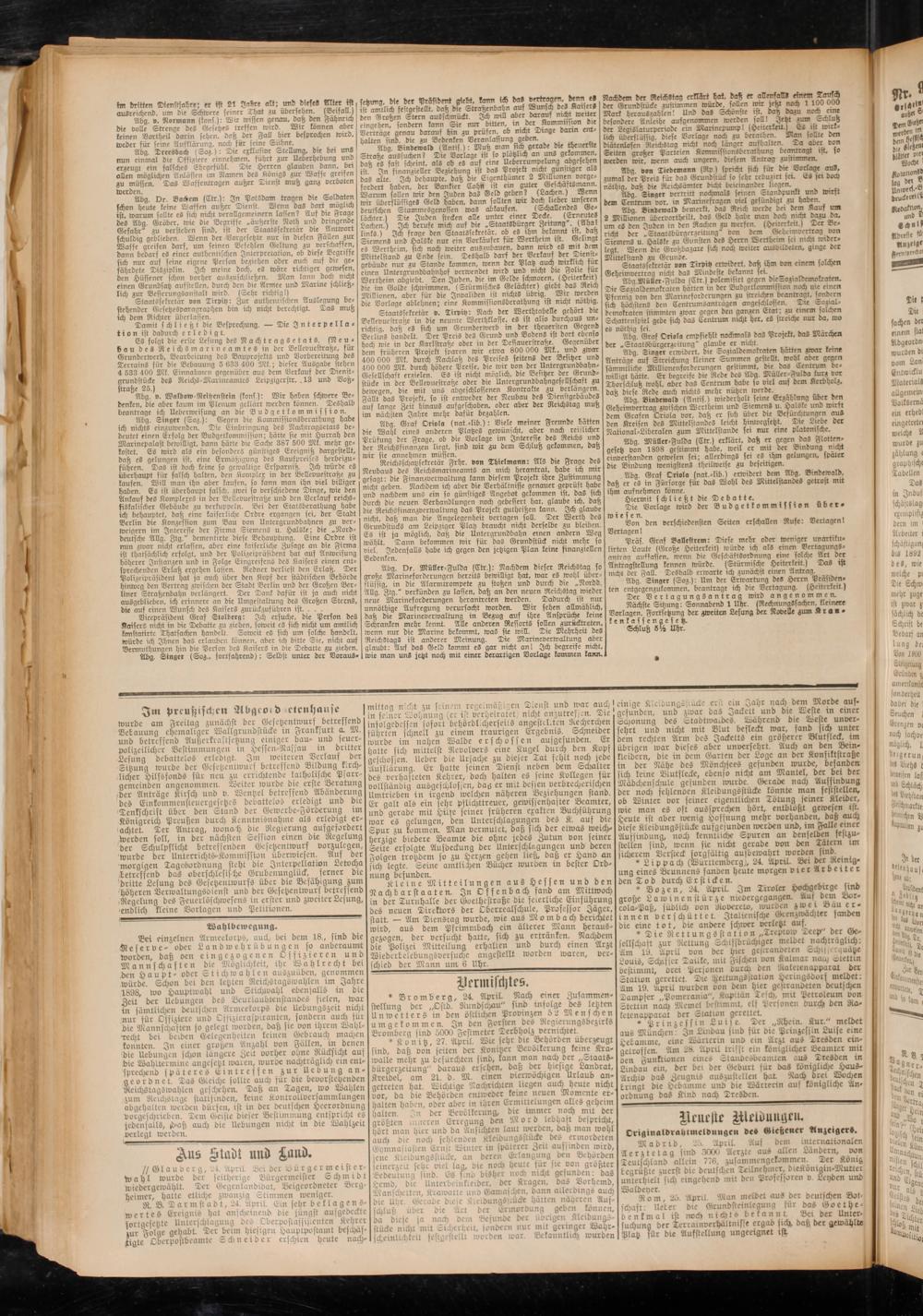 Abg. Dr. Müller-Fulda (Ctr.): Nachdem dieser Reichstag so große Marineforderungen bereits bewilligt hat, war es wohl überflüssig, in die Alarmtrompete zu stoßen und durch die „Nordd. Allg. Ztg." verkünden zu lassen, daß an den neuen Reichstag wieder neue Marineforderungen herantreten werden. Dadurch ist nur unnöthige Aufregung verursacht worden. Wir sehen allmählich, daß die Marineverwaltung in Bezug auf ihre Ansprüche keine Schranken mehr kennt. Alle anderen Ressorts sollen zurücktreten, wenn nur die Marine bekommt, was sic will. Tie Mehrheit deS