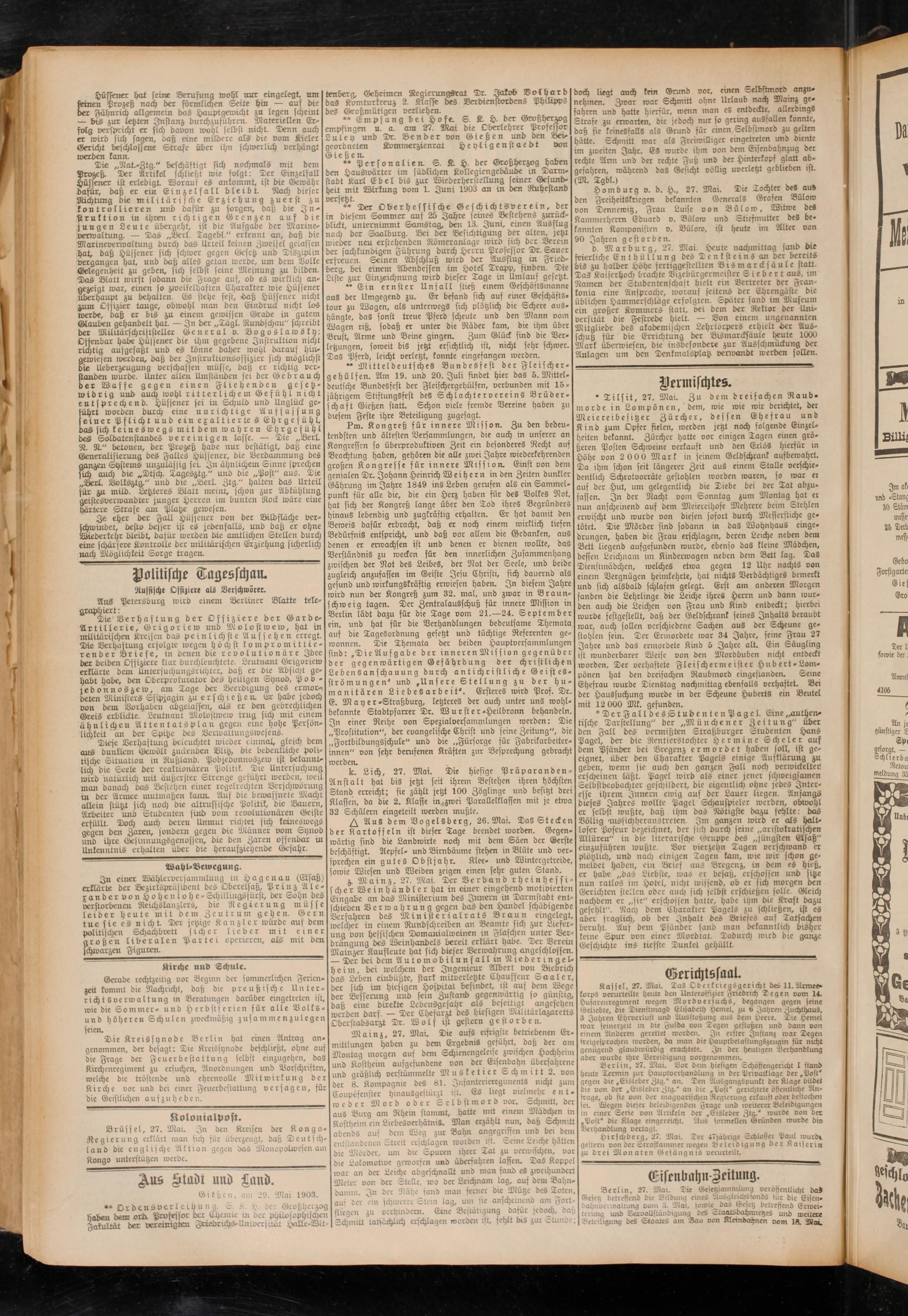 Gi tßen, am 29 Mai 1903. ! dämm. In der Nähe fand man ferner die Mütze des ^oten, ~ v B ........ - * g W’ A. auf der ein schwerer Stein lag, um sie anscheinend am Fort-