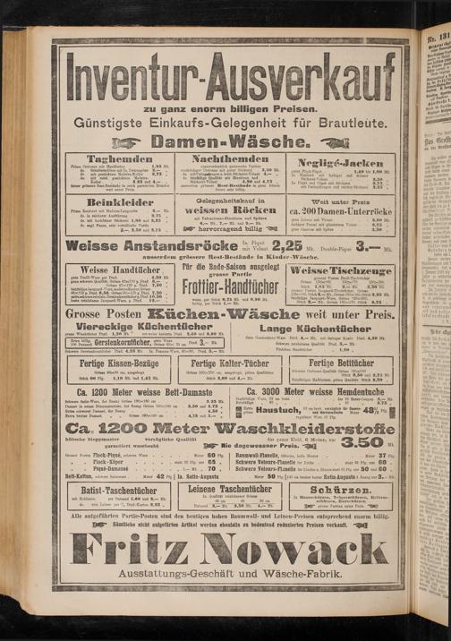 Alle aufgeführten Parties-Posten sind den heutigen hohen Baumwoll- und Leinen-Preisen entsprechend enorm billig, w Sämtliche nicht aufgefürten Artikel werden ebenfalls zu bedeutend reduzierten Preisen verkauft.