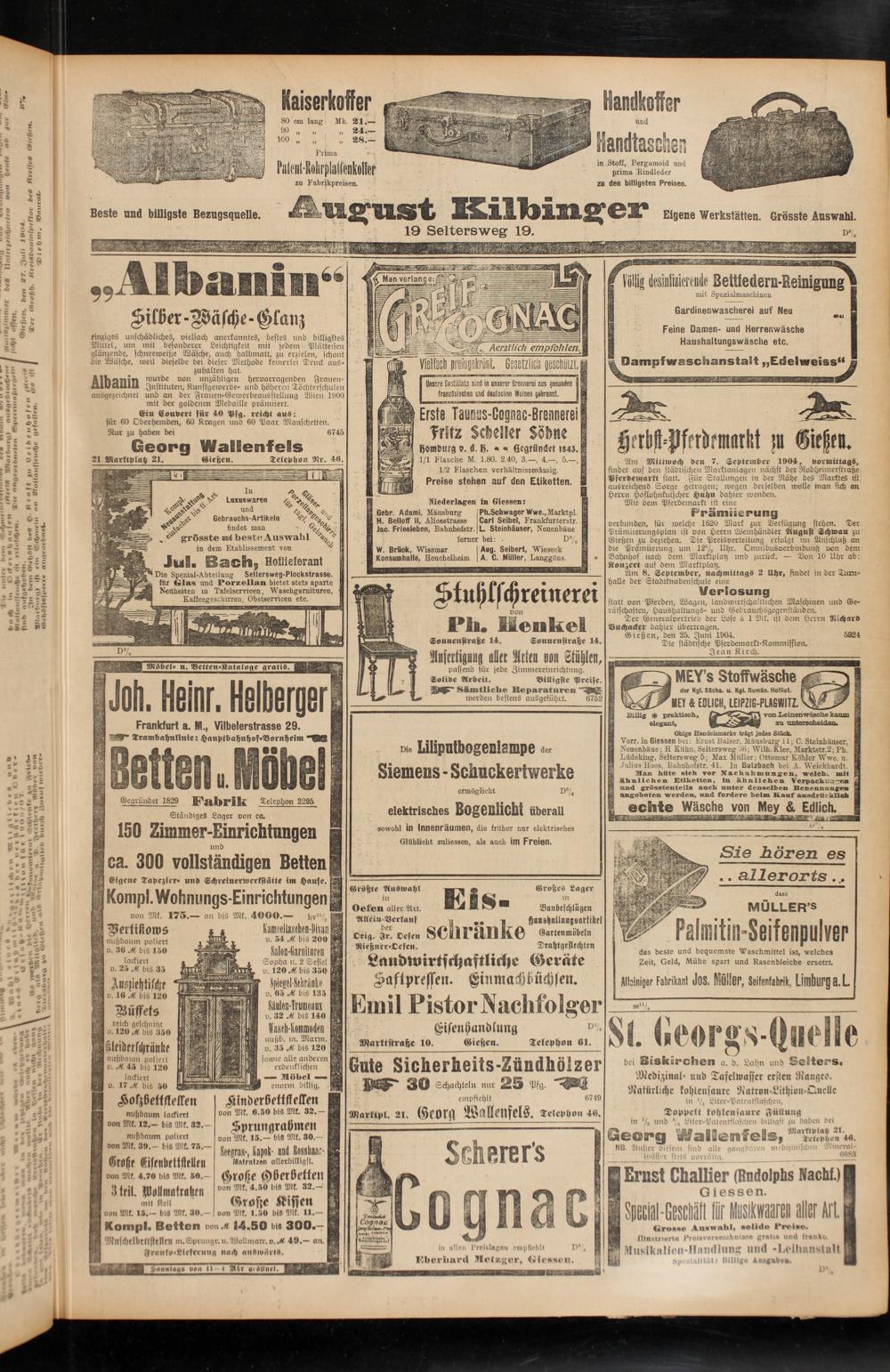 Am Mittwoch den 7. September 1904, vormittags, findet auf den städtischen Marktantagen nächst der NodHeimerstraße Pferdemarkt statt. Für Stallungen in der Nähe des Marktes rst ausreichend Sorge getragen; wegen derselben wolle man sich an Herrn Hoflohnkutscher Huhu dahier wenden.