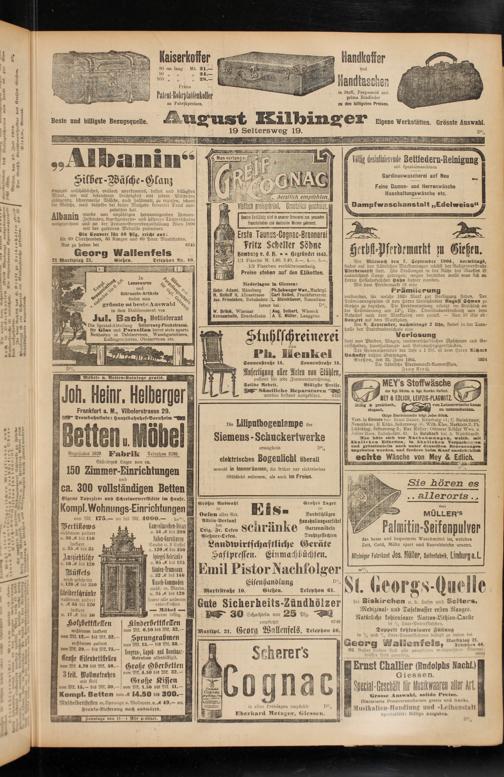 Vorr. in Giessen bei: Ernst Balser, Mäusburg 11; C. Steinhäuser, Neuenbäue; H Kühn, Seltersweg 36; Wilh.Klee, Marktstr.2; Ph. Lüdeking, Seltersweg 5; Max Müller: Ottomar Köhler Wwe. u. Julius Hoos. Bahnhofstr. 41. In Butzbach bei A. Weickhardt.