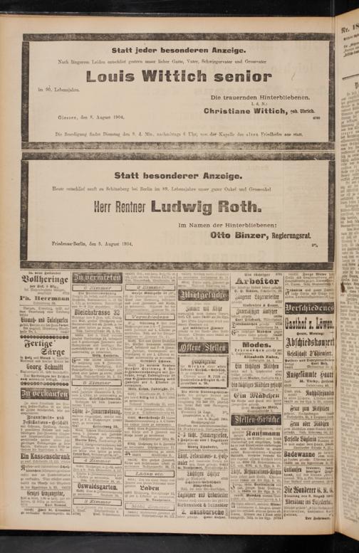 Die Beerdigung findet Dienstag den 9. d. Mts., nachmittags 6 Uhr, von der Kapelle des alten Friedhofes aus statt.