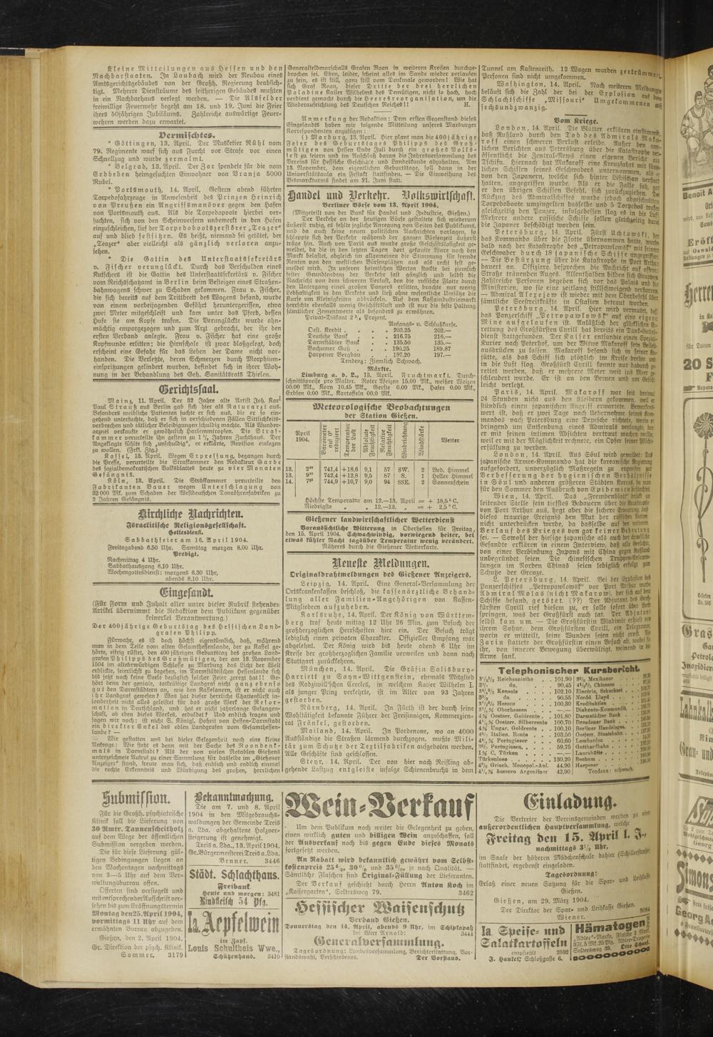 Borauösichtliche Witterung in Oberhessen für Freitag, den 15. April 1904. Schtvackwindig, vorwiegend heiter, bei etwas kühler Nacht tagsüber Temperatur wenig verändert.