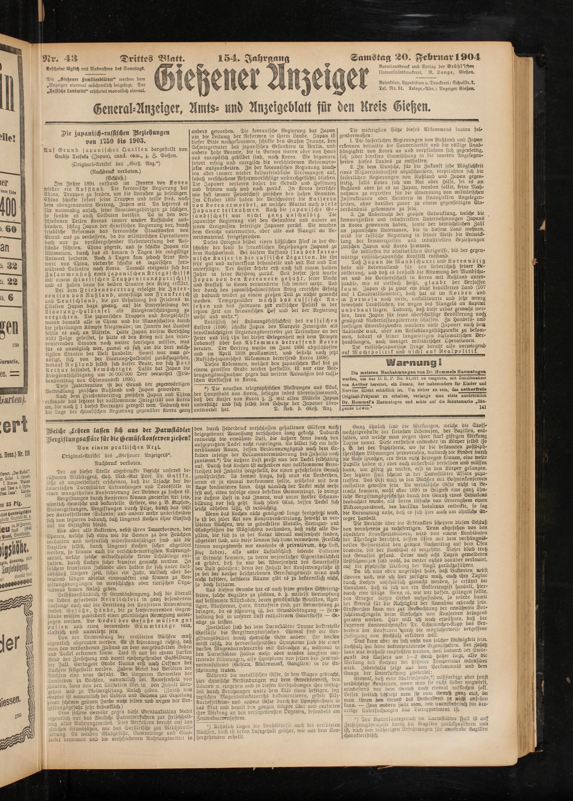 Der an dieser Stelle abgedruckte Bericht unseres berühmten Mitbürgers, Geh. Med.-Rat Prof. Dr. Gafsky, läßt es unzweifelhaft erscheinen, daß die Ursache der be- dauerUchen Darmstädter Ertränkungen und Todesfälle in ■einer mangelhaften Konservierung der Bohnen zu suchen ist.