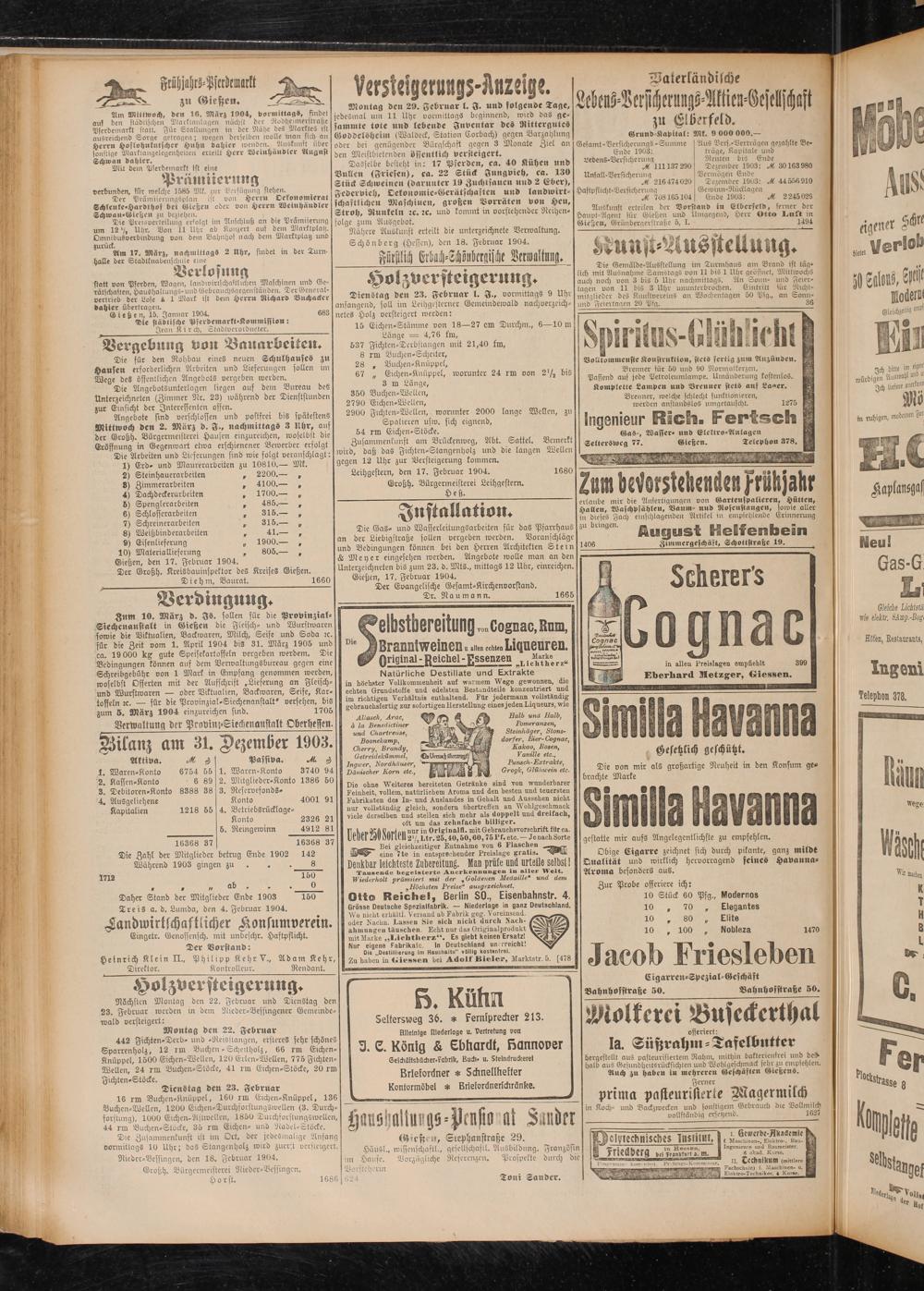 Zum 10. März d. IS. sollen für die Provinzial- Siechcuanstalt in Gießen die Fleisch- und Wurstwaren sowie die Viktualien, Backwaren, Milch, Seife und Soda rc. für die Zeit vom 1. April 1904 bis 31. März 1905 und ca. 19 000 kg gute Speisekartoffeln vergeben werdem. Die Bedingungen können auf dem Verwaltungsbureau gegen eine Schreibgebühr von 1 Mark in Empfang genommen werden, woselbst Offerten mit der Aufschrift „Lieferung an Fleischund Wurstwaren — oder Viktualien, Backwaren, Seife, Kartoffeln re. — für die Provinzial-Siechenanstalt" versehen, bis zum 5. März 1904 einzureichen sind. 1705