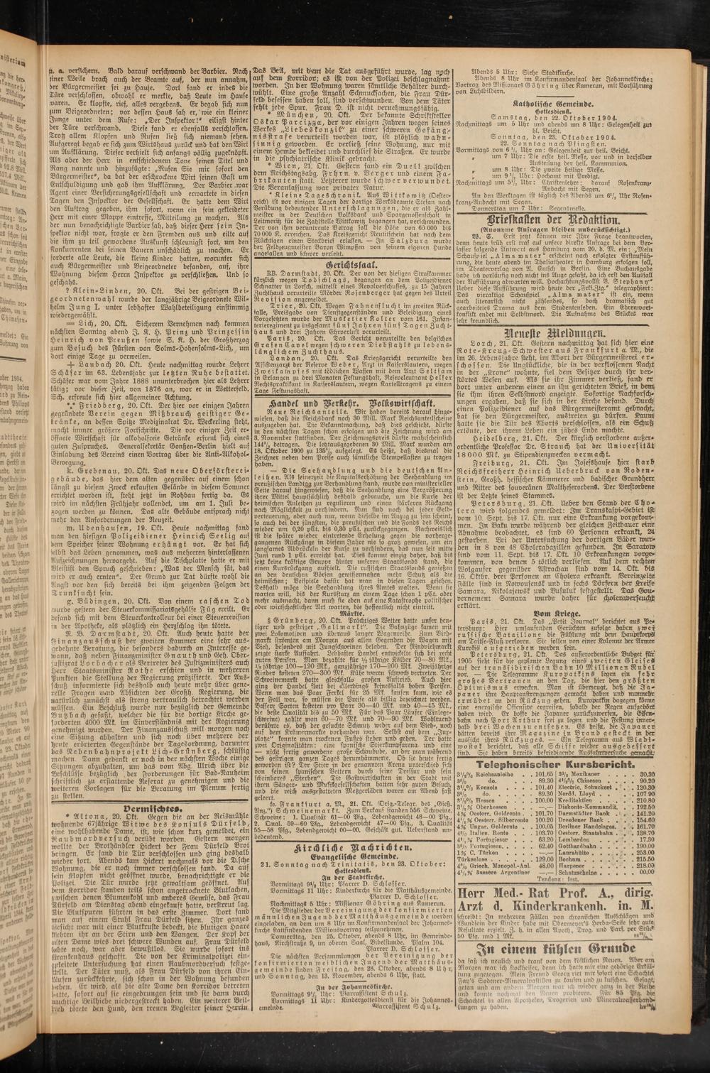 Land an, 20. Okt. Das Kriegsgericht verurteilte den Assistenzarzt der Reserve Weber, Arzt in Kaiserslautern, wegen Zweikampfes mit tödlichen Waffen mit dem Arzt Seltsam in Erlangen zu drei Monaten Festungshaft, Reseveleutnant Helfer Rechtspraktikant in Kaiserslautern, wegen Kartelltragens zu einem Tage Festungshaft.