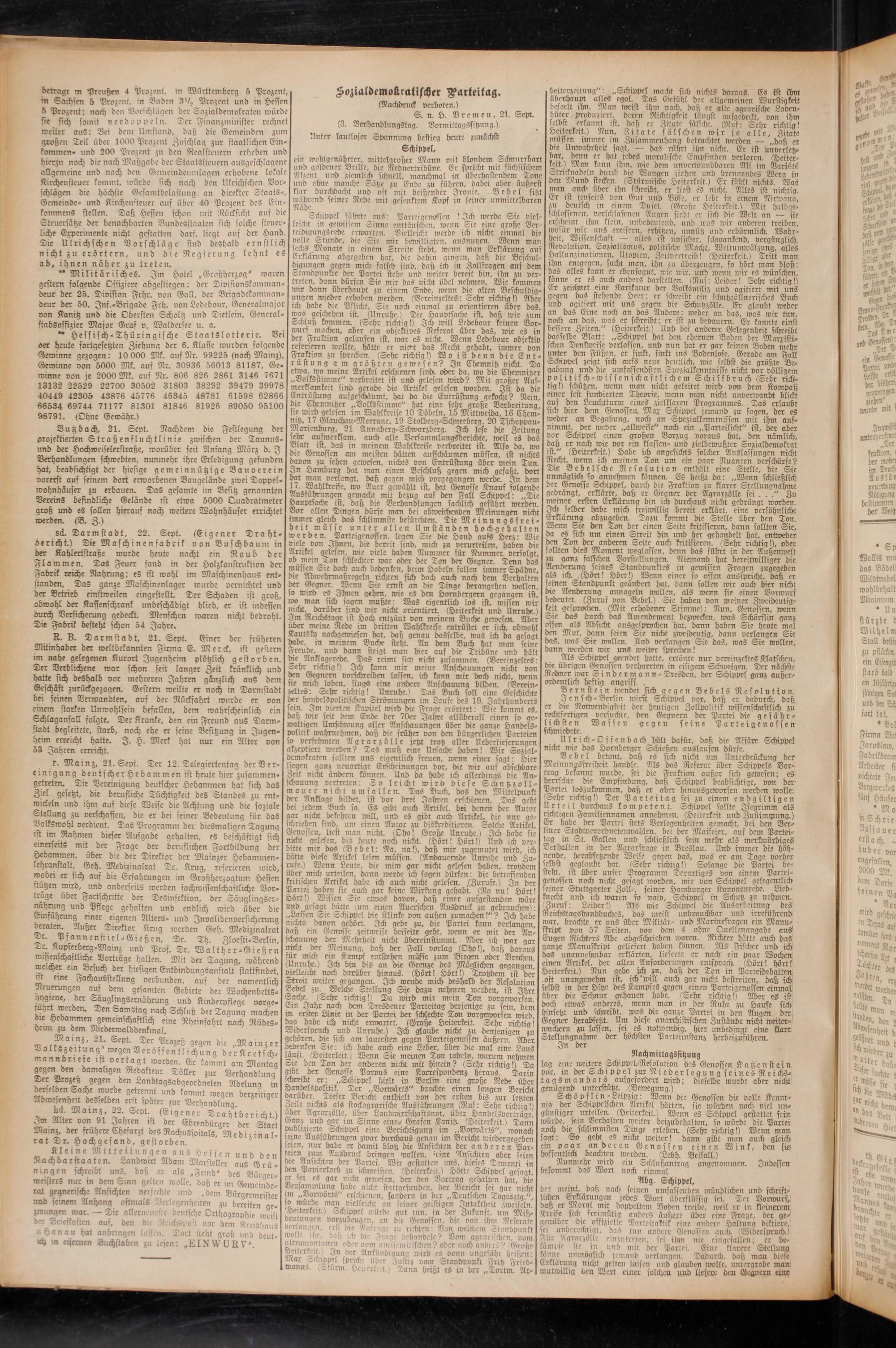 Er spricht mit sächsischem Akzent und ziemlich schnell, manchmal in überhastendem Tone und ohne manche Satze zu Ende zu führen, dabei aber äußerst Nar durchdacht und oft mit beißender Ironie. Bebel sitzt luähTcnb seiner Rede mit gesenktem Kopf in seiner unmittelbaren Nähe.
