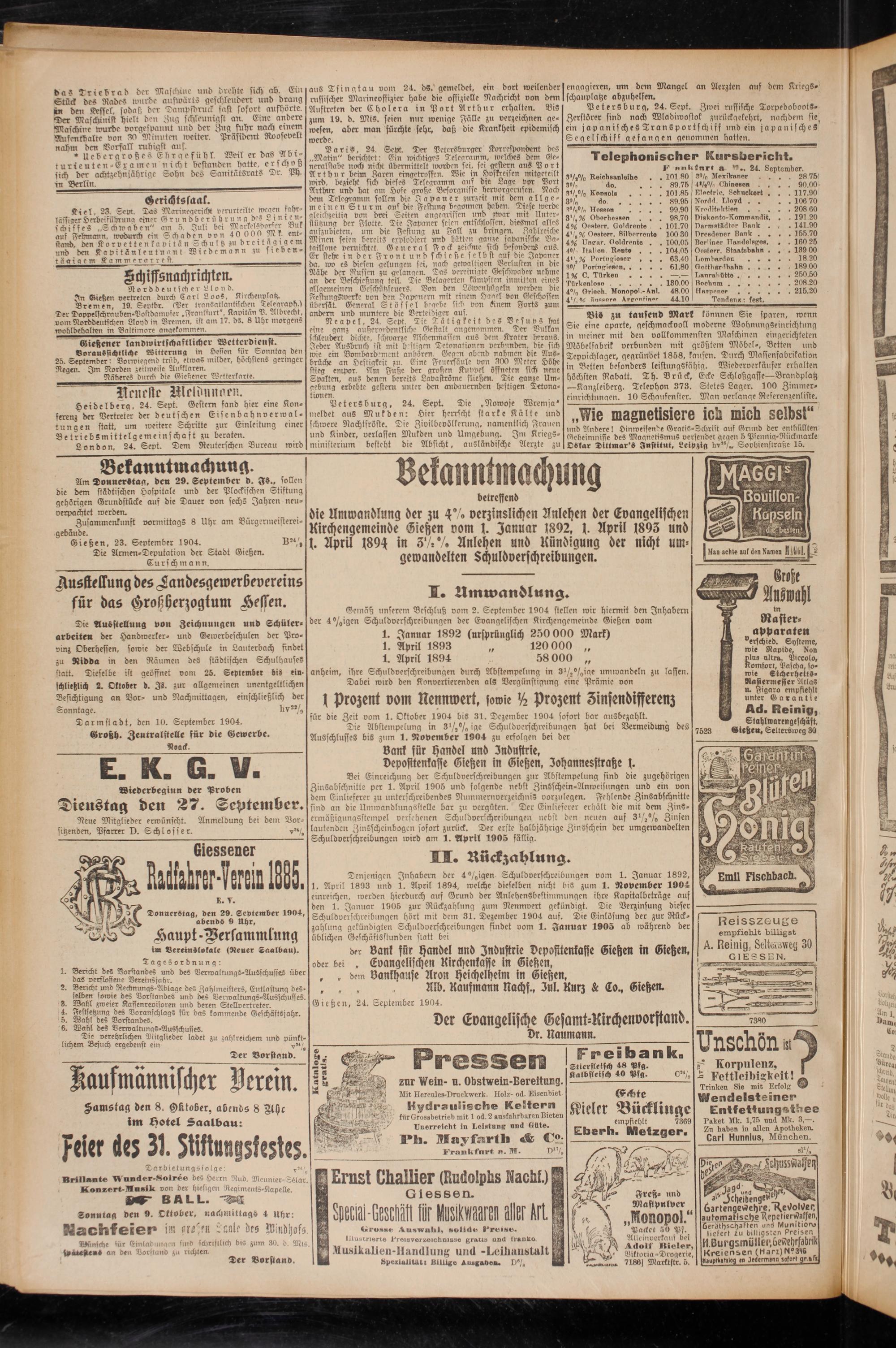 Gemäß unserem Beschluß vom 2. September 1904 stellen wir hiermit den Inhabern der 4 %igcn Schuldverschreibungen der Evangelischen Kirchengemeinde Gießen vom