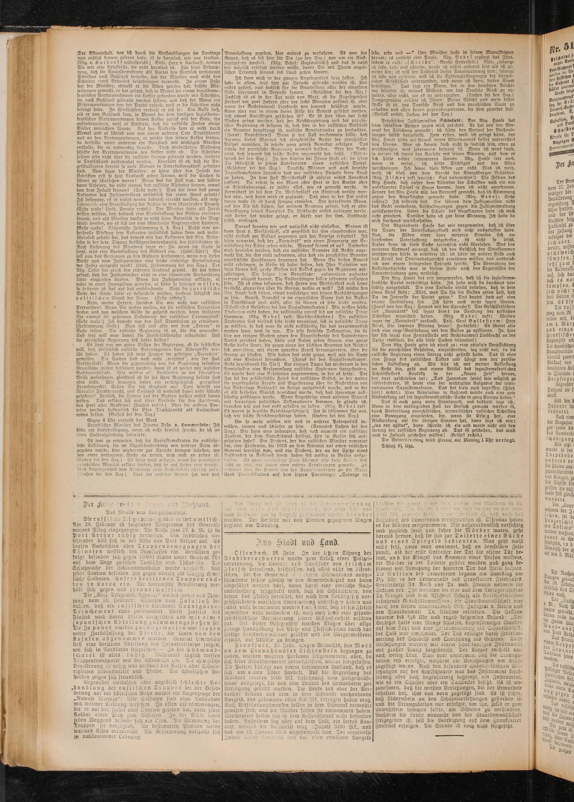 Die russis ch c.T.l g (Phon- guhir unlbct a m t li d) : Am 28. Februar ist folgendes Tetegramm des Generalmajors Pflug eingegangen: Die Nacht zum 27. d. M. ist in Port Arthur ruhig verlausen. Ein feindliches Geschwader hält sich in der Nähe von Port Arthur auf. Es lausen Nachrichten über Truppenbewegungen d e r Chinesen westlich des Liausiufses ein. Gerüchten zufolge befinden sich gegen 10000 9.iiaun unter General Ma auf dem Wege zwischen Tundschu und Tschad rin. Tie Schutzwache der Schinmintunbahu wurde verstärkt. Auf jeder Station befinden sich gegen vierzig bis fündig chinesische Soldaterr. Unsere berittenen Truppen rück- ten in Korea ein. Die koreanische Bevölkerung verhält sich gegen uns freundschaftlich