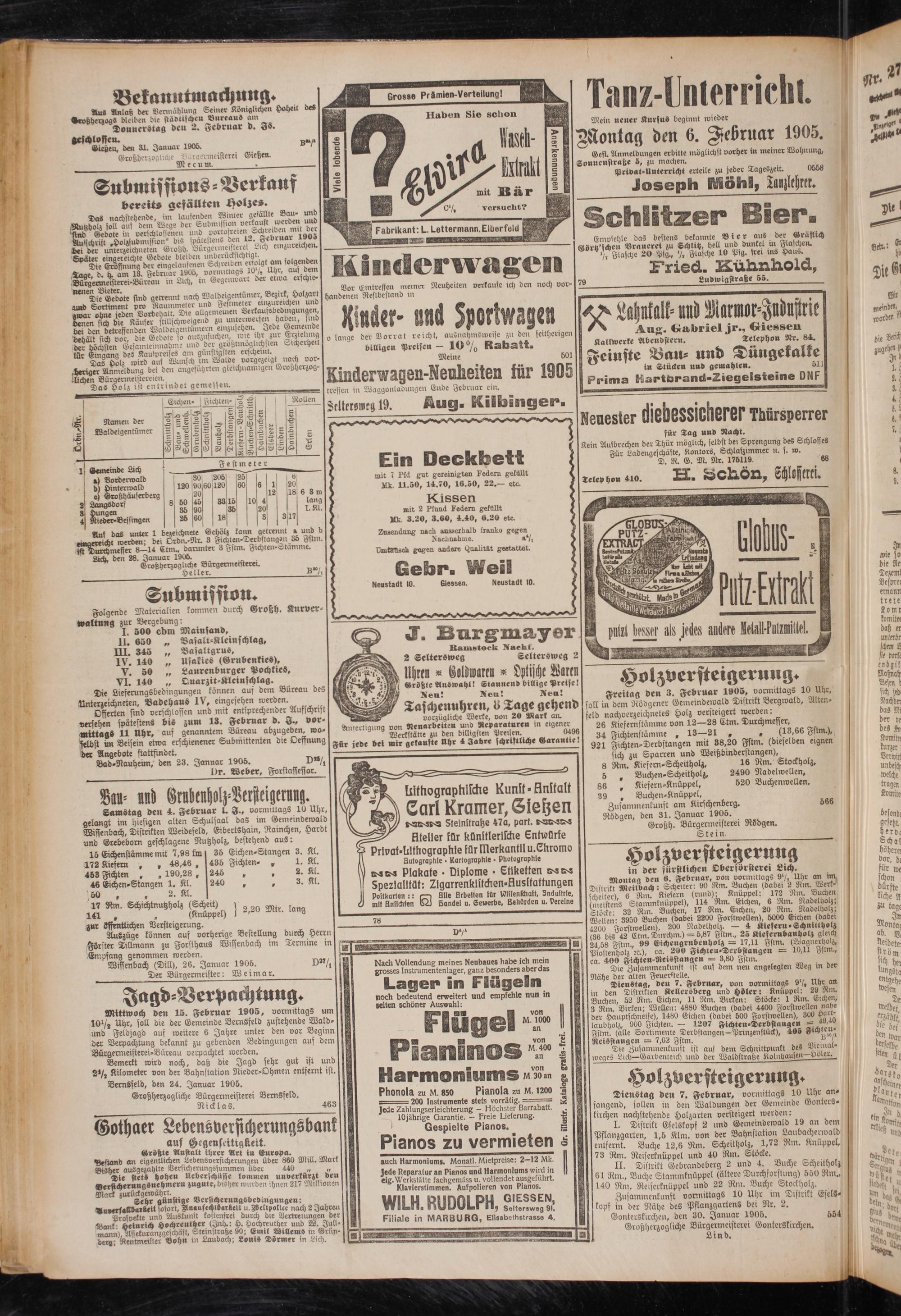 Die Eäffnung der eingelansenen Schrerben eno gt am iolgende d. b. am lä. Februar 190o, vormittags 10 /, tthr, aus oem -Bürgermelslerei-Büreau in Lich, in Gegenwart der ettva erschie- sind getrennt nach Waldeigentümer, Bezirk Holzart Sortiment pro Raummeter und Festmeter euizureichen und ^r o^si jeden Vorbehalt. Die aUgemeuieii Verkautshedmgungen ienen sich die Käufer stillschweigend zu unter-werfen haben, stnd bet den betreffenden Waldeigentümern einzusehen. Jede Gemeinde beb alt sich vor, die Gebote so auszusuchen, rote ihr jur §^elung öcr höchsten Gesamteinnahmc und der groszlmoglrchslen Sicherheit kür Eingang des Kaufpreises am gtinfUgsten erscheint.