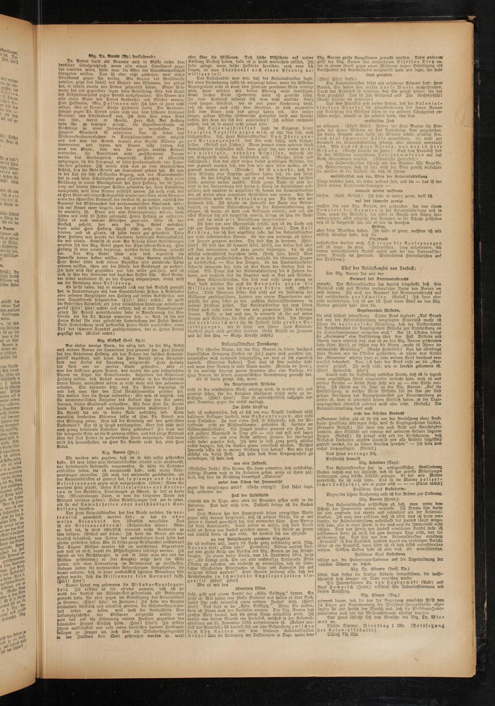Ich habe nur eine Ehrenpflicht erfüllt, daß ich die Sache erst jetzt zur Sprache brachte. (Sehr wahr! im Zeutr.) Dem Fall Kersting, den ich hier angeführt habe, hat der Kolonialdirettor gar nicht widersprechen können. Er hat nur verlangt, cs sollten ihm Zeugen genannt werden. Die find ihm ja benannt. (Hört, hört!) Es sind ihm 23 benannt (hört, hört!), von diesen sind aber erst drei vernommen, und zwar gerade diejenigen, die ich als absolut nebensächlich bezeichnet hatte. (Lebh. hort, hört!) Man hat es in der gewissenlosesten Weise versucht, die schwarzen Zeugen zu beeinflussen. — Von den Dingen, die der Stationsvorsteher Schmidt begangen hat, habe ich hier kaum den fünften Teil erwähnt. Alle Dinge sind der Kolonialabteilung seit 3 Jahren bekannt, und trotzdem sind die Beamten noch in Amt und Würden.