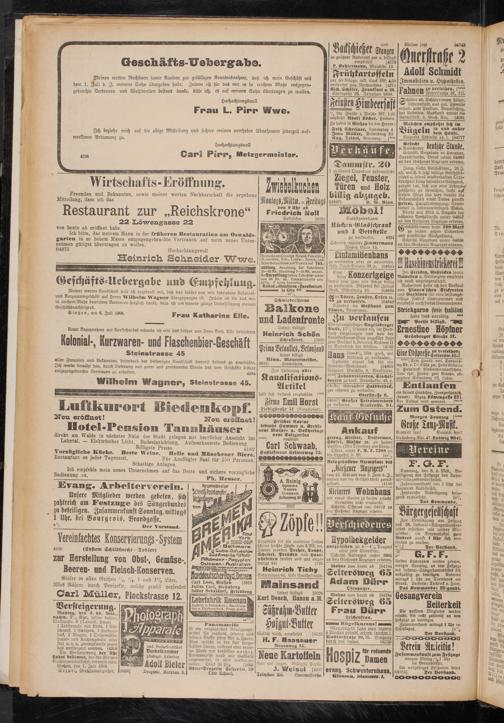 Meinen werten Nachbarn sowie Kunden zur gefälligen Kenntnisnahme, daß ich mein Geschäft mit dem 1. Zuli d. I. meinem Sohn übergeben habe. Indem ich für das mir in so reichem Maße entgegengebrachte Vertrauen und Wohlwollen bestens danke, bitte ich, es auf meinen Sohn übertragen zu wollen.