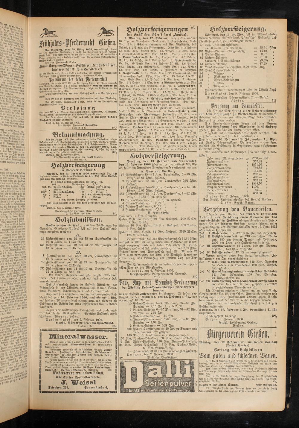 Montag, den 12. Februar 1906, vormittags 9'/, Nhr beginnend, werden im Gießener Stadtwald in den Distrikten Walds- hnt und Hecgstrauch versteigert:
