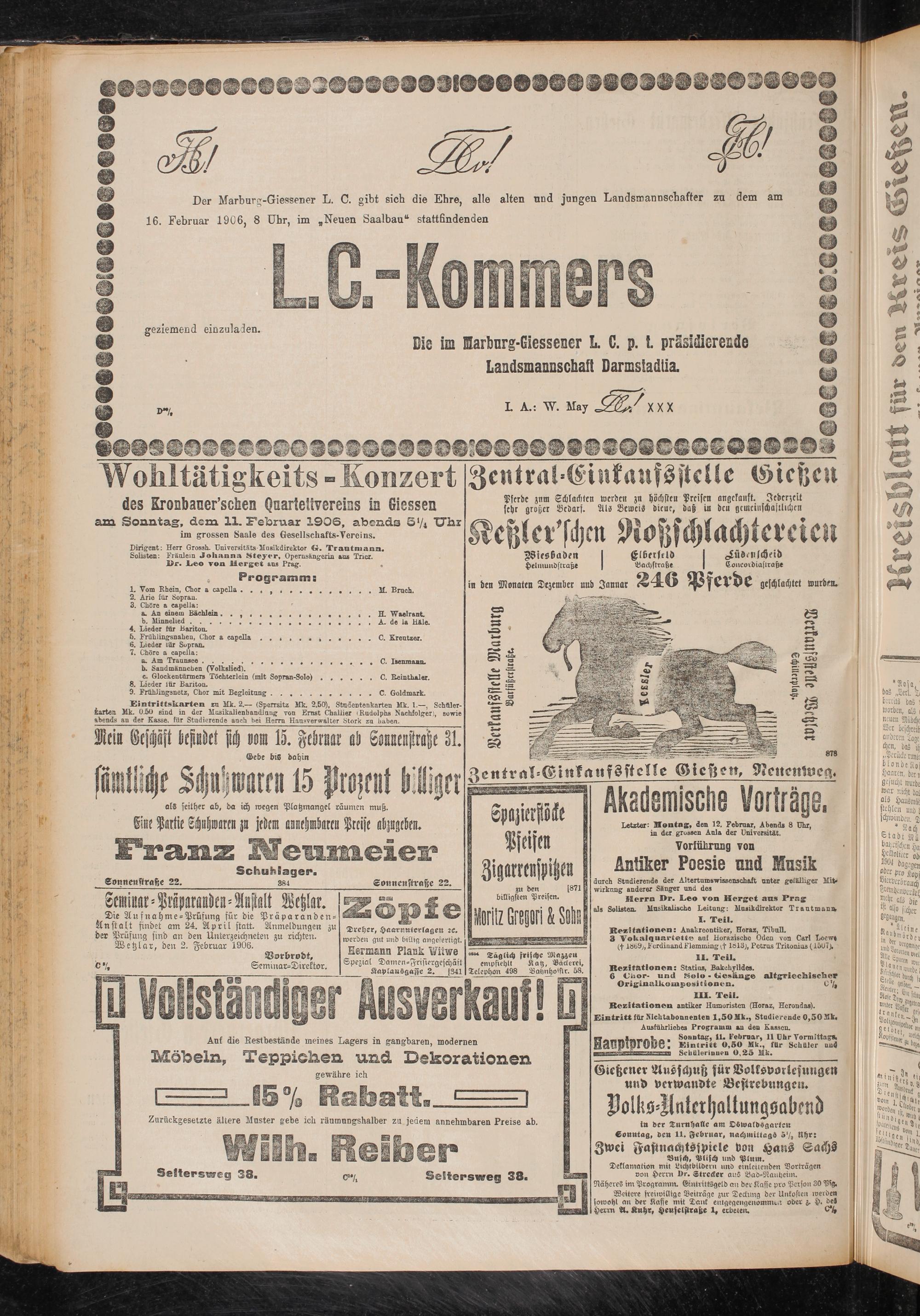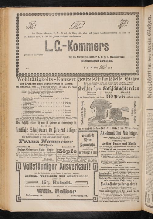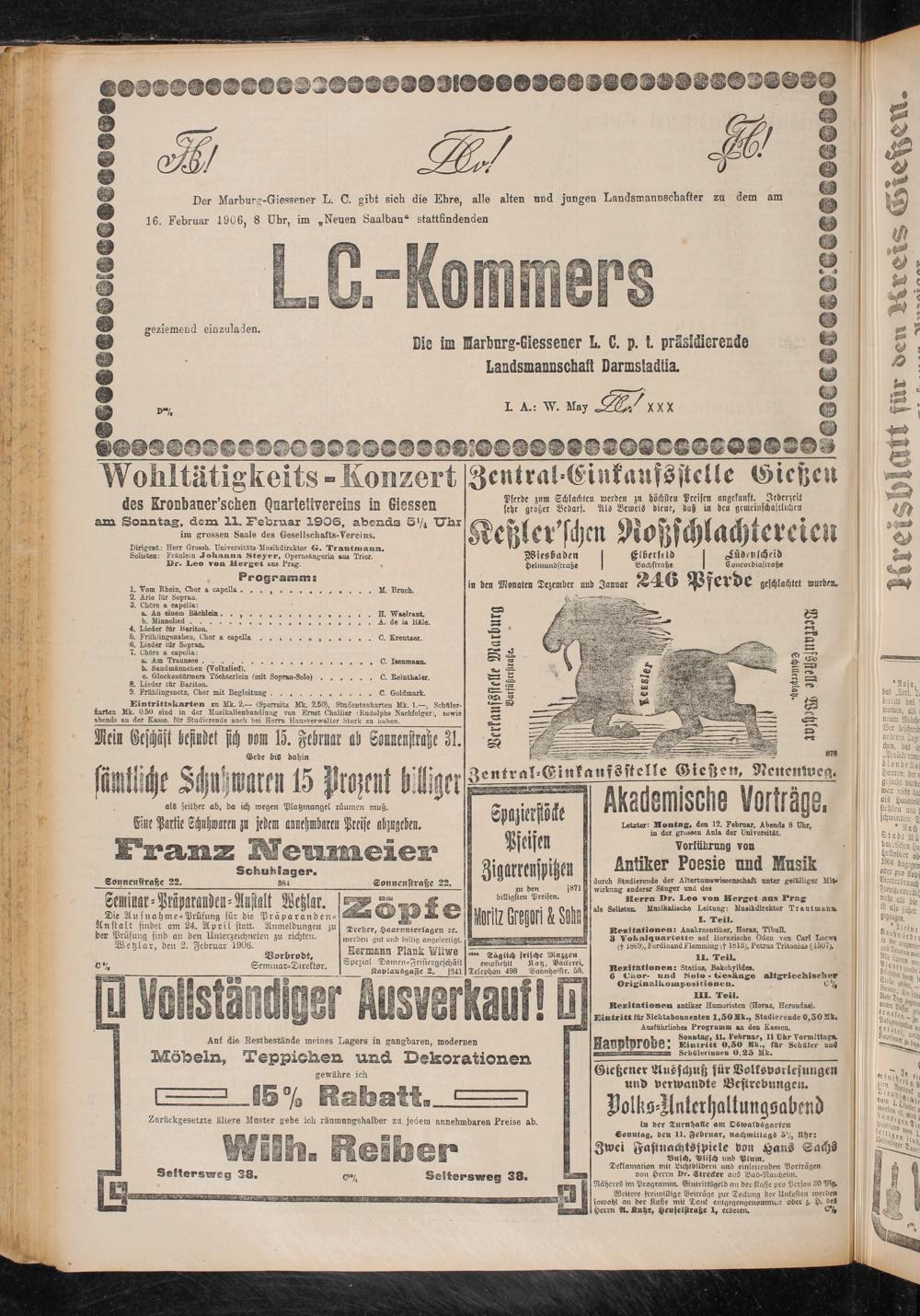 Der Marbur^-Giessener L. C. gibt sich die Ehre, alle alten nnd jungen Landsmannschafter zu dem am 16. Februar 1906, 8 Uhr, im „Neuen Saalbau“ statt finden den