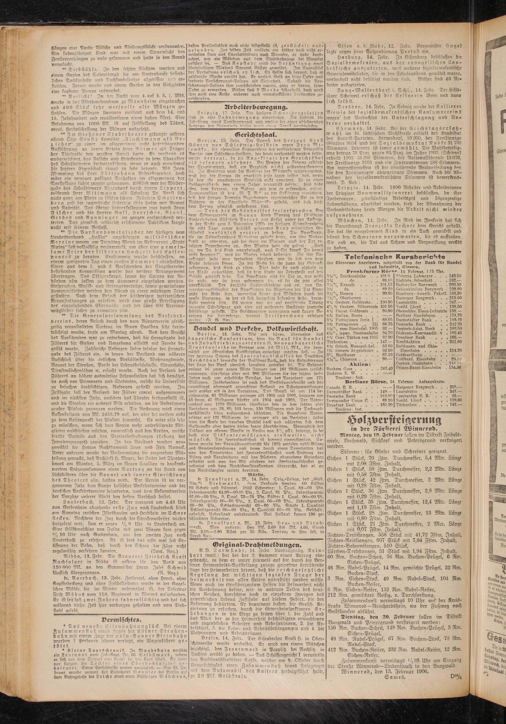 Berlin, 14. Febr. Der Eisendrehcr Ernst H. in Ober- fchonweide wurde verhaftet. Ec wird von einem Mädchen bezichtigt, den Frauenmord in Popplitz bei Rochlitz in wachsen verübt zn haben. — Das Schöffengericht I verurteilte den Kcaftdroschkenführer Kotzke, welcher am 9. Oktober durch Unvorsichtigkeit einen Zusammenstoß seines Fahrzeuges mit dem Automobil de§ Kaisers herbeigeführt hatte. Izu 20 Mk. Geldstrafe.
