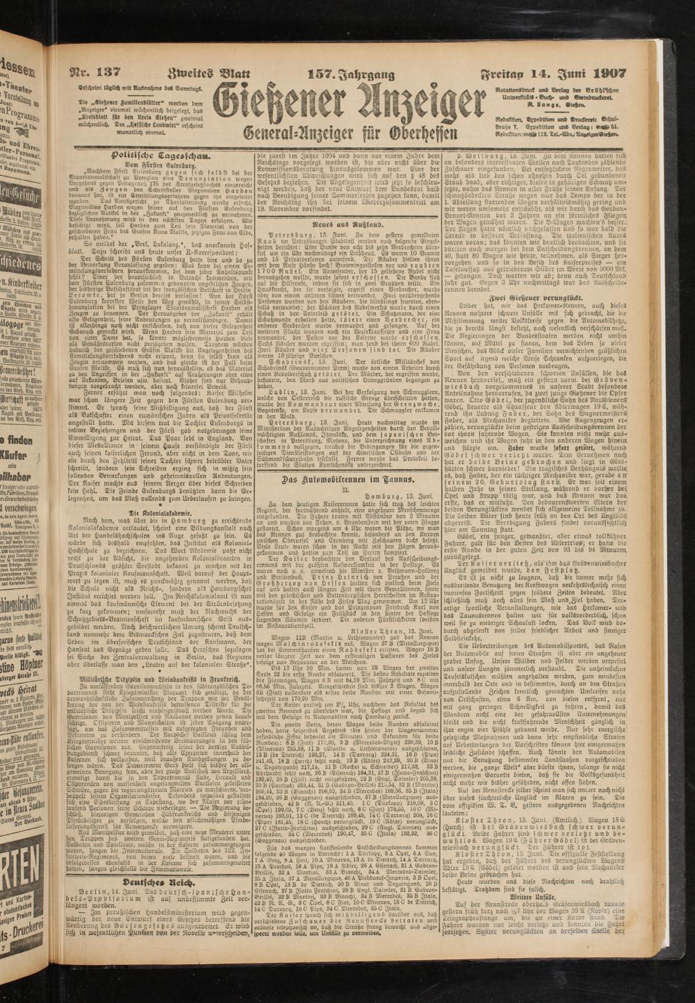 Zu dem heutigen Kaiserrennen hatte sich trotz des leichten Regens, der fortwährend anhielt, eine ungeheure Menschenmenge eingefunden. Die Fahrer traten mit Abständen von 2 Minuten an und wurden von Frhrn. v. Brandenstein mit der roten Flagge gestartet. Schon morgens um 4 Uhr waren die Plätze, wo man das Rennen gut beobachten konnte, besonders an den Kurven zwischen Oberursel und Cronberg mit Zuschauern dicht besetzt. Biele Leute waren schon in der Nacht mit den Zügen heraus- getommen und hatten zum Teil im Freien kampiert.
