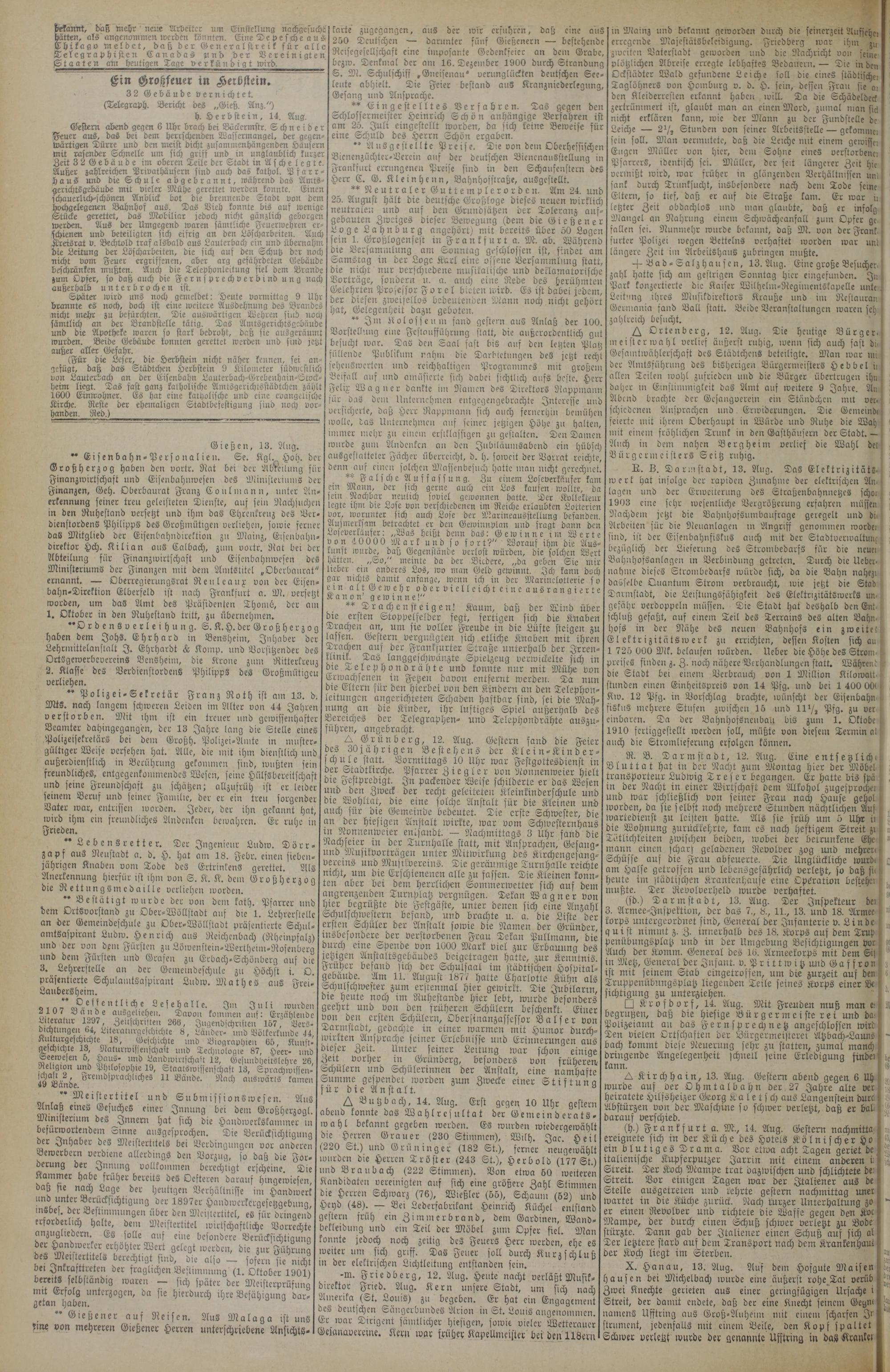 Gestern übend gegm 6 Uhr brach bei Bäckermstr. Schneider Feuer aus, das bei dem herrschenden Wassermangel, der gegenwärtigen Dürre und den meist dicht zusammenhängenden Häusern mit rasender Schnelle um sich griff und in unglaublich kurzer Zeit 32Gebäude im oberen Teile der Stadt in Asche legte. Außer zahlreichen Privathäusern sind auch das kathol. Pfarrhaus und die Schule abgebrannt, während das Amtsgerichts gebäude mit vieler Mühe gerettet werden konnte. Einen ichauerlich-schönen Anblick bot die brennende Stadt von dem hochgelegenen Bahnhof aus. Das Vieh konnte bis auf wenige Stücke gerettet, das Mobiliar jedoch nicht gänzlich geborgen werden. Aus der Umgegend waren sämtliche Feuerwehren erschienen und beteiligten sich eifrig an den Löscharbeiten. Auch ÄtetSrat v. Bechtold traf alsbald aus Lauterbach ein und übernahm die Leitung der Löscharbeiten, die sich, auf den Schutz der noch nicht vom Feuer ergriffenen, aber arg gefährdeten Gebäude beschränken mußten. Auch die Telephonleitung fiel dem Brande zum Opfer, so daß auch die Fernsprechverbind ung nach außerhalb unterbrochen ist.