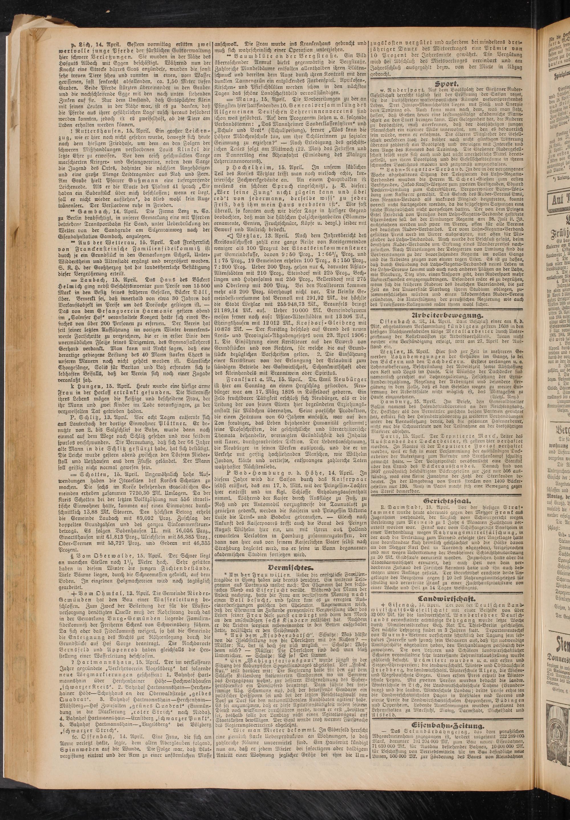 p. Lich, 14. April. Gestern vormittag erlitten zwei wertvolle junge Pferde der fürstlichen Gutsverwaltung hier schwere Verletzungen. Sie wurden in der Nähe des HvfgutS Albach mit Eggen beschäftigt. Während nun der Knecht eine Strecke dürres Gras anzündete, wurden die sonst sehr treuen Tiere scheu und rannten in einen, vom Master gerissenen, fast senkrecht abfallenden, ca. 1,50 Meter tiefen Graben. Beide Pferde stürzten übereinander in den Graben und die nachschleifende Egge mit den nach unten stehenden Zinken auf sie. Nur dem Umstand, daß Gutspächter Klein mit seinen Leuten in der Nähe war, ist es zu danken, daß die Pferde aus ihrer gefährlichen Lage rasch heraus befördert werden konnten, jedoch ist es zweifelhaft, ob die Tiere am Leben erhalten werden können.