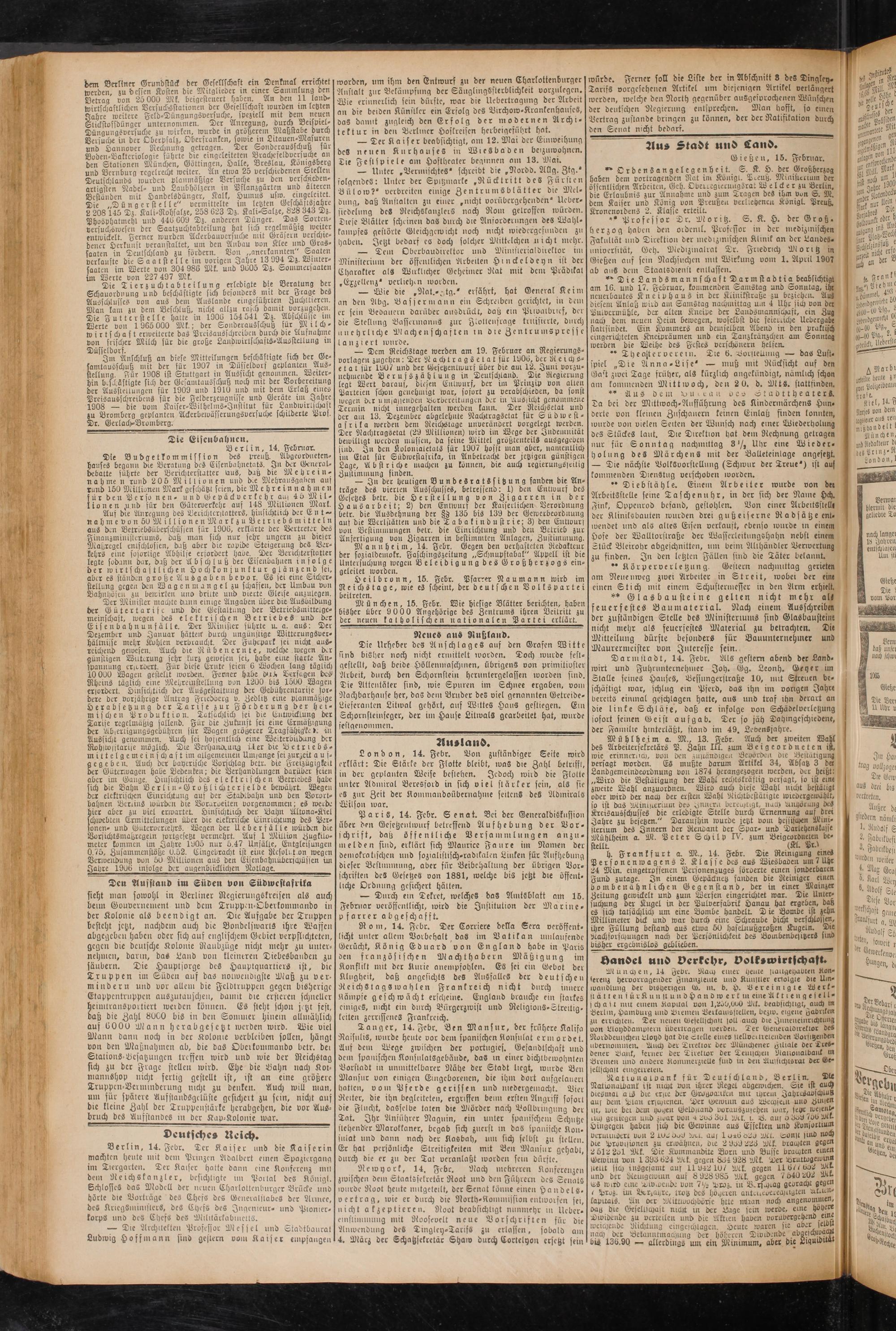 Berlin, 14. Fcbr. Ter Kaiser und die Kaiserin machten heute mit dem Prinzen Adalbert einen Spaziergang im Tiergarten. Ter Kaiser hatte dann eine Konferenz mit dem Reichskanzler, besichtigte un Portal des König!. SchlosieS das Modcll der neuen Charlottenburger Brücke rind Hörle die Vorträge des Chefs des Generalslabcs der Armee, deS Krlcgsminislcrs, des Chefs des Ingenieur- und Pionier- korps und deS Chefs des Militärkaburetls.
