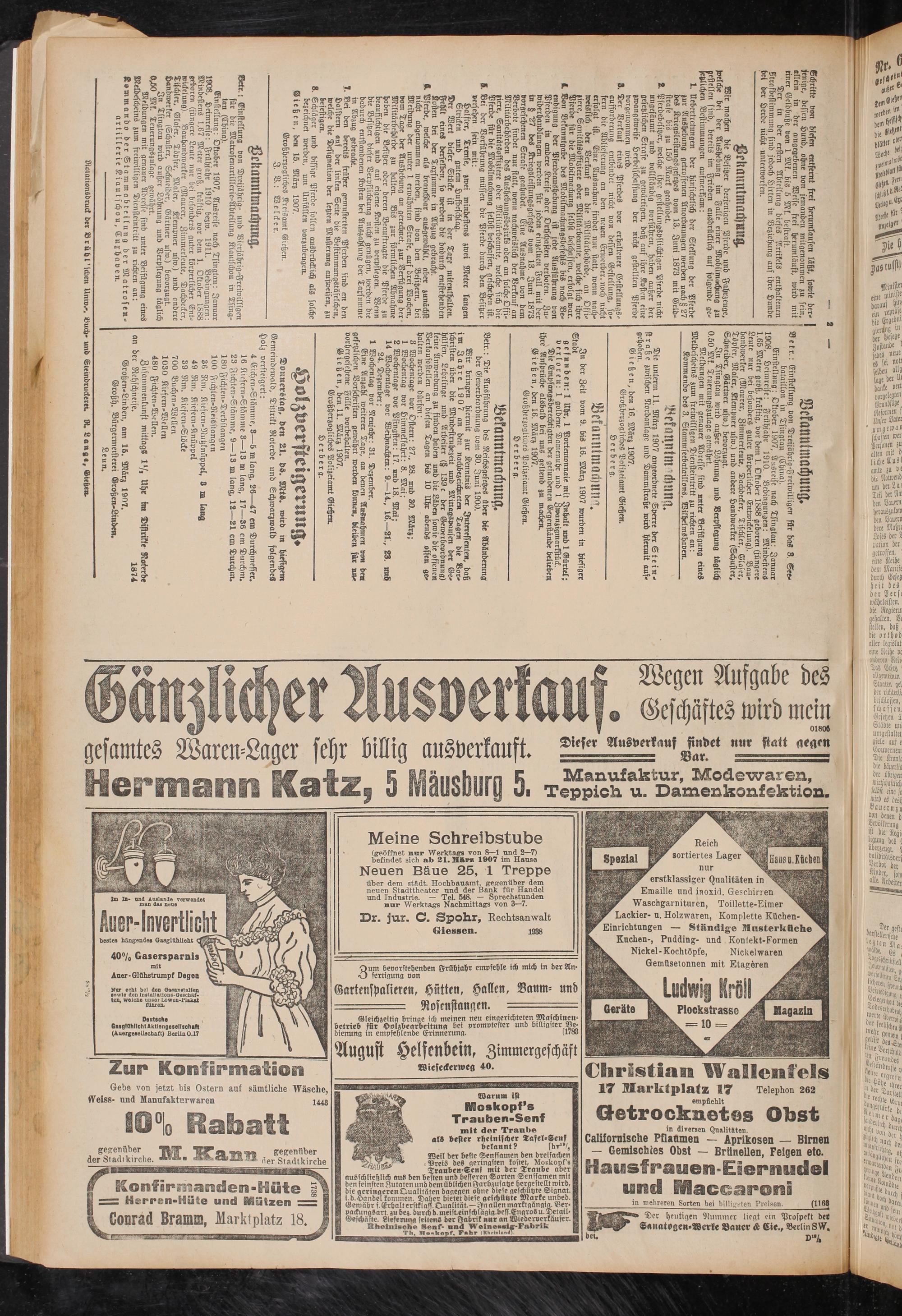 (geöffnet nur Werktags von 8—1 und 2—7) befindet sich ab 21. Mttrz 1907 im Hause