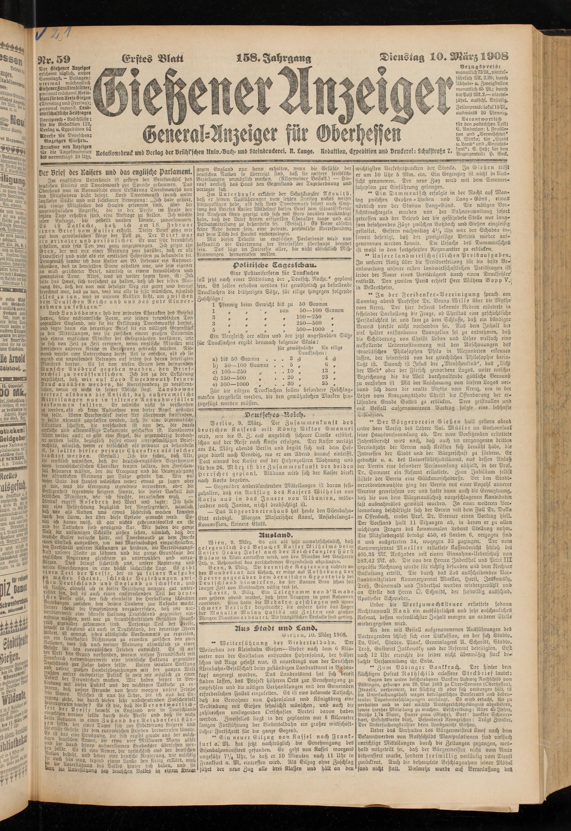 "Zum Vüdinger Bankkrach. Der hinter dem flüchtigen Hofrat Rothschild erlassene Steckbrief lautet: Gegen den unten beschriebenen Bankier Ludwig Rothschild von Büdingen, geboren am 28. Mai 1863 zu Ober-Seemen (Obcrhessen), Jsraeltt, verheiratet, der flüchtig ift oder sich verborgen hält, ist tue Untersuchungshaft wegen betrügerischen Bankerotts und bedeutender Depotunterschlagungen verhängt. Es wird ersucht, ihn 51t verhaften und in das nächste Amtsgerichtsgefängnis abzllliefcrn, sowie hierher Mitteilung zu machen. Beschreibung: Alter 45 Jahre, Größe 1,74 Meter, Haare grau (Glatze), Bart: dunkler Schnurrbart, Gesichtsfarbe blaß. Besonderes Kennzeicheir: Trägt Zwicker. Der Untersuchungsrichter beim Landgericht Gießeii.