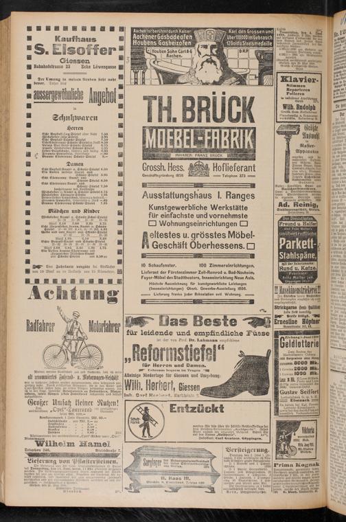 Lieferant der Fürstenzimmer Zell-Romrod u. Bad-Nauheim, Foyer-Möbel des Stadttheaters, Inneneinrichtung Neue Aula. Höchste Auszeichnung für kunstgewerbliche Leistungen (Inneneinrichtungen) Oberh. Gewerbe-Ausstellung 1898. Lieferung franko jeder Bahnstation evtl. Wohnung.
