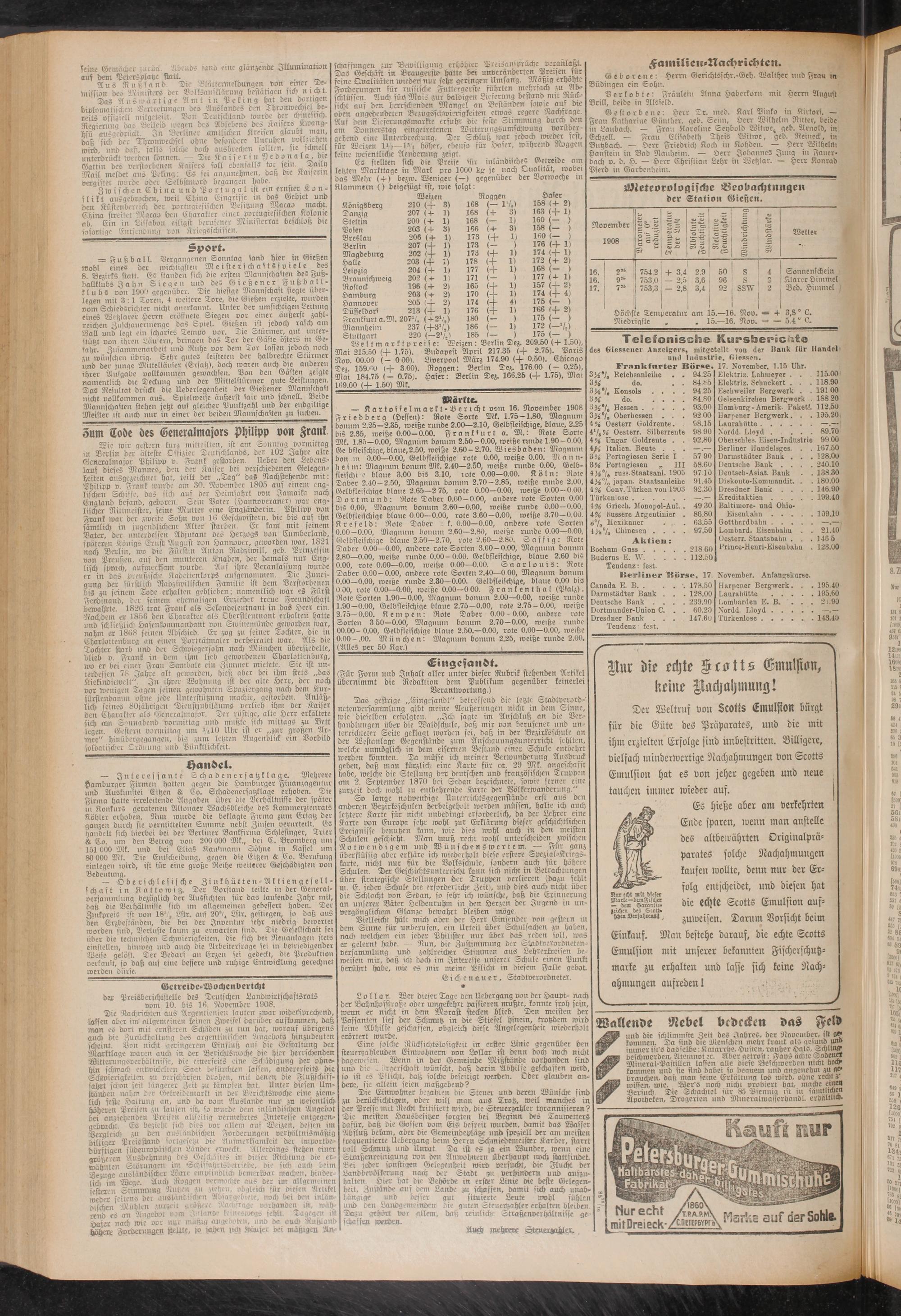 Gestorbene: Herr Tr. meb. Karl Pinko in Kirtorf. — Frau Katharine Günther, geb. Sein;, Herr Wilhelm Ritter, beide in Laubach. — Frau Karoline Seybold Witwe^ geb. Arnold, in Echzell. — Frau Elisabeth Theis Witwe, geb. Reineck, in Butzbach. — Herr Friedrich Koch in Kohden. — Herr Wilhelstr Haustein in Bad Nauheim. — Herr Johannes Jung in Fauerbach v. d. H. — Herr Ehrisiian Lehr in Wetzlar. — Herr Konrad Pferd in Garbenheim.